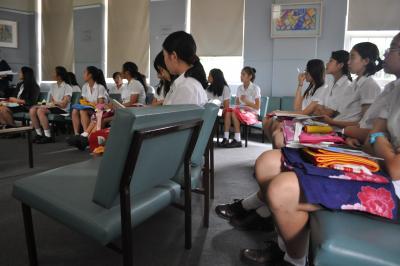 また、プロジェクトの一環で「きもの」文化を海外へ発信するための教育プログラムを開発することを目指して、上記研究メンバーのうち、第1回目として2009年度に薩本教授と斉藤教授が英国在住の学生や社会人を対象にゆかたの着装ワークショップを実施しました。第2回目として2010年度に薩本教授と斉藤教授がイギリスでの中学生対象のゆかた着装ワークショップを実施しました。また、同年度に第3回目としてメンバーの呑山教授、斉藤教授、川端教授およびTAの学生が中国上海在住の学生と社会人を対象にした「きもの」文化に関するゆかたワークショップを実施しました。第4回目として目2011年度に斉藤教授、薩本教授と川端教授および学生9名の総勢11名でイギリスの中学生と大学生を対象にゆかた着装ワークショップを実践しました。第5回目としては斉藤教授、川端教授、薩本教授と学生ら総勢19名で、米国サンフランシスコにて、きもの紹介の講義と、ゆかたの着装ワークショップを行いました。さらに、昨年度(2014年度)に、第6回目として薩本教授ほか、斉藤教授、川端教授、扇澤教授、阿部教授、佐原様および学生2名の計8名でアメリカのポートランドに赴き、現地の学校4校(Sheridan Japanese School、Grant High School、International School of Beaverton、Valley Catholic High School)の日本語履修の生徒を対象にゆかたの着装ワークショップを行ってきました。