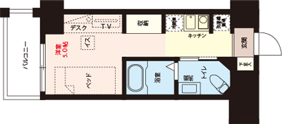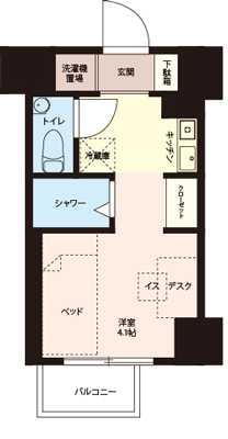 ミニキッチン(IHクッキングヒーター)、 トイレ(ウォシュレット付)、 シャワー(浴槽なし)、下駄箱、 クローゼット、インターホン、 洗濯機置き場(洗濯機なし)、エアコン、 室内物干し器具、デスク、チェア、 ベッド(マットレス付)、デスクライト、冷蔵庫 | ||