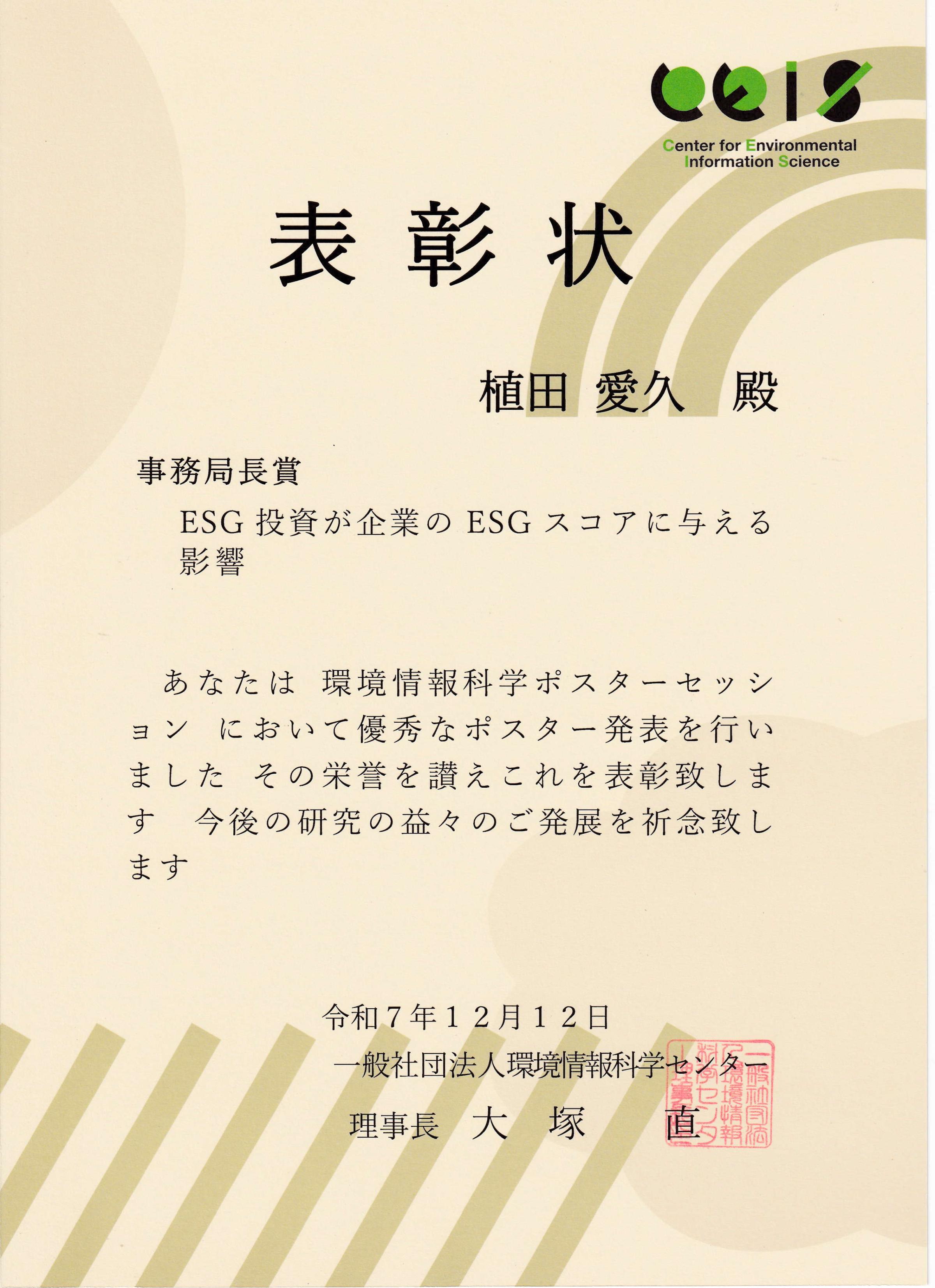 受賞研究テーマは、「ESG投資が企業のESGスコアに与える影響」です。