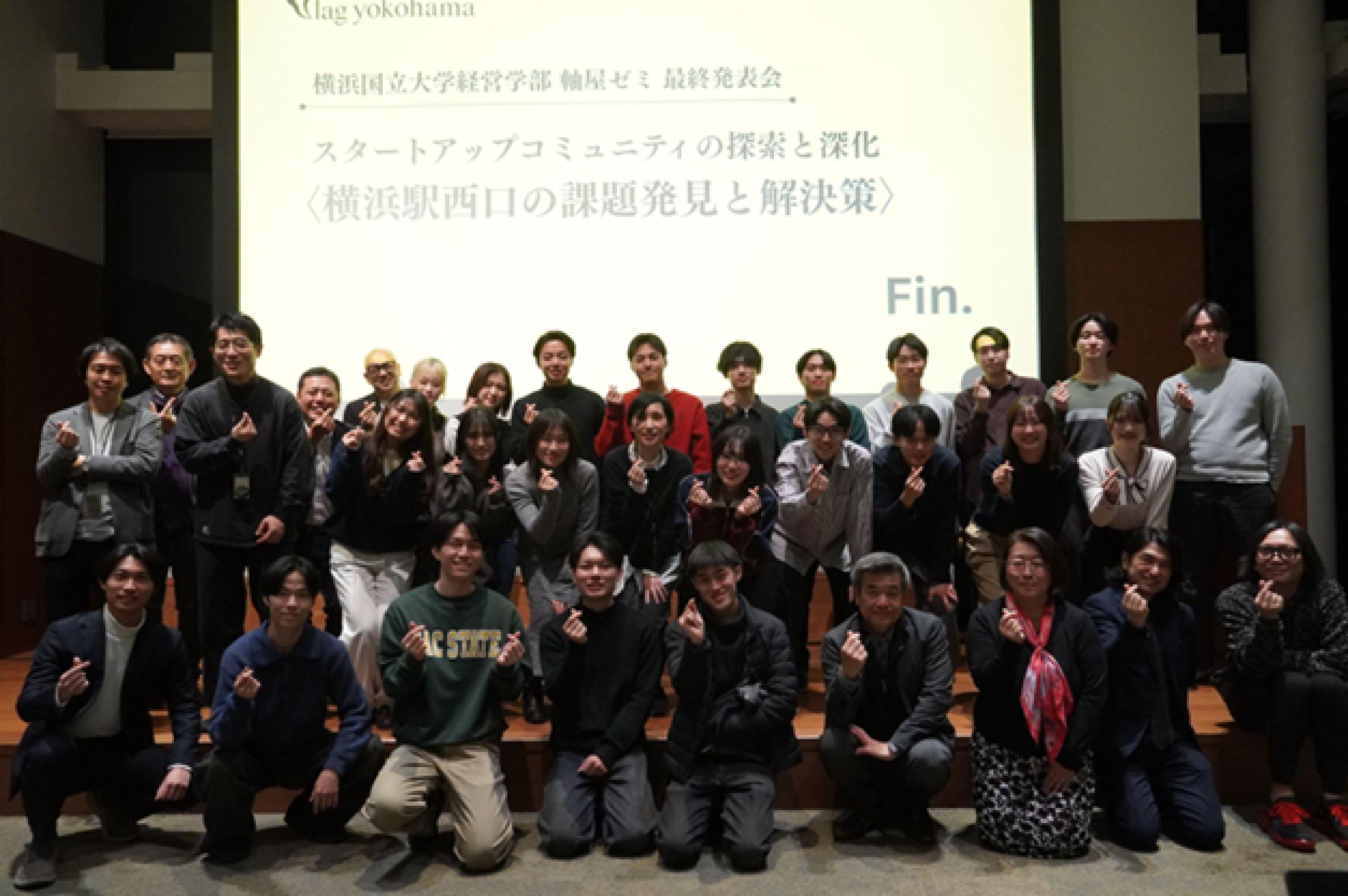 横浜国立大学経営学部軸屋ゼミは、2026年1月30日(金)、「横浜」駅直結のTHE YOKOHAMA FRONT最上階42階にある事業共創を目的とした複合施設「Vlag yokohama」にて、2026年度の最終発表会を実施いたしました。本発表会は「スタートアップコミュニティの探索と深化〈横浜駅西口の課題発見と解決策〉」をメインテーマに据え、学生たちが約2か月間にわたる徹底的なフィールドワークと議論を経て練り上げた施策を、第一線で活躍する審査員や一般来場者の前で発表するものです。
