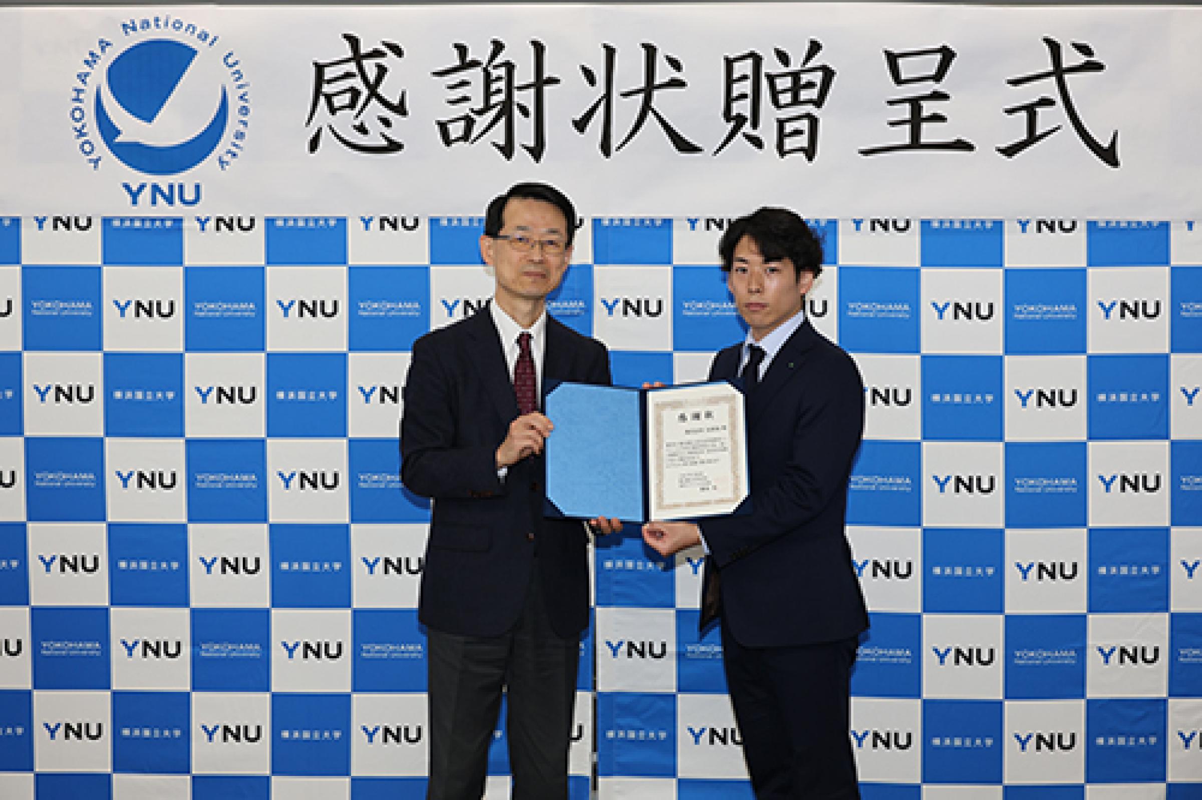 その後、勝地学府長より、都市イノベーション学府は2011年にできた文理融合の大学院で、所属する多くの学生が社会インフラや建築に携わるような業種へ就職することもあり、このような機会をいただき感謝していると挨拶があり、同じく感謝状を贈呈いたしました。