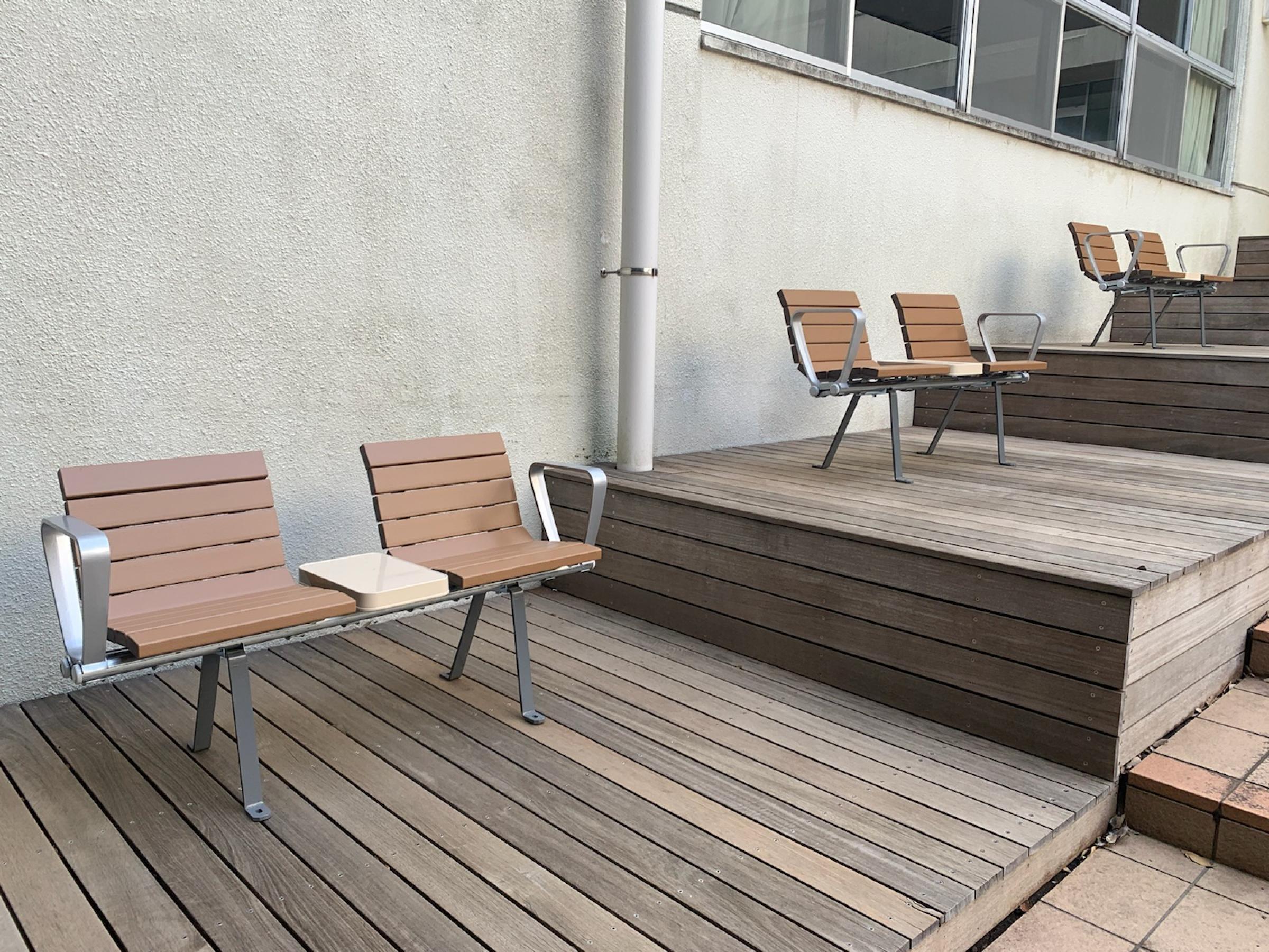 また、屋外空間でのソーシャルディスタンスを確保できるように、一方向型でテーブル付きのベンチを講義棟正面に設置しました。お天気の良い日に食事をしたり、休憩するのにご活用ください。