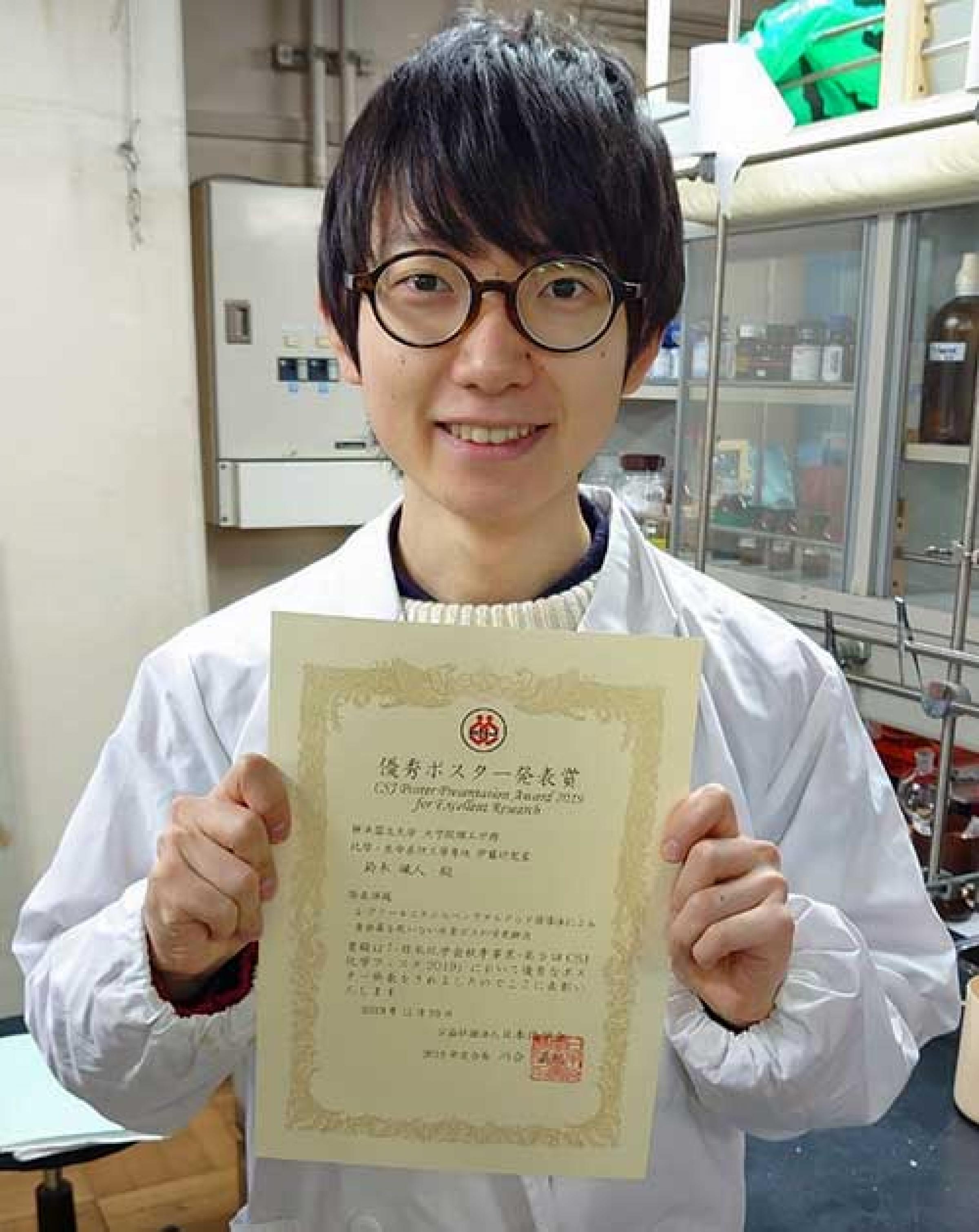 大学院理工学府 博士課程前期 1年の鈴木颯人さん(指導教員:伊藤傑 准教授)が、 2019年 10月 15日(火)〜 17日(木)にタワーホール船堀で開催された第9回CSJ化学フェスタ2019で優秀ポスター発表賞を受賞しました。