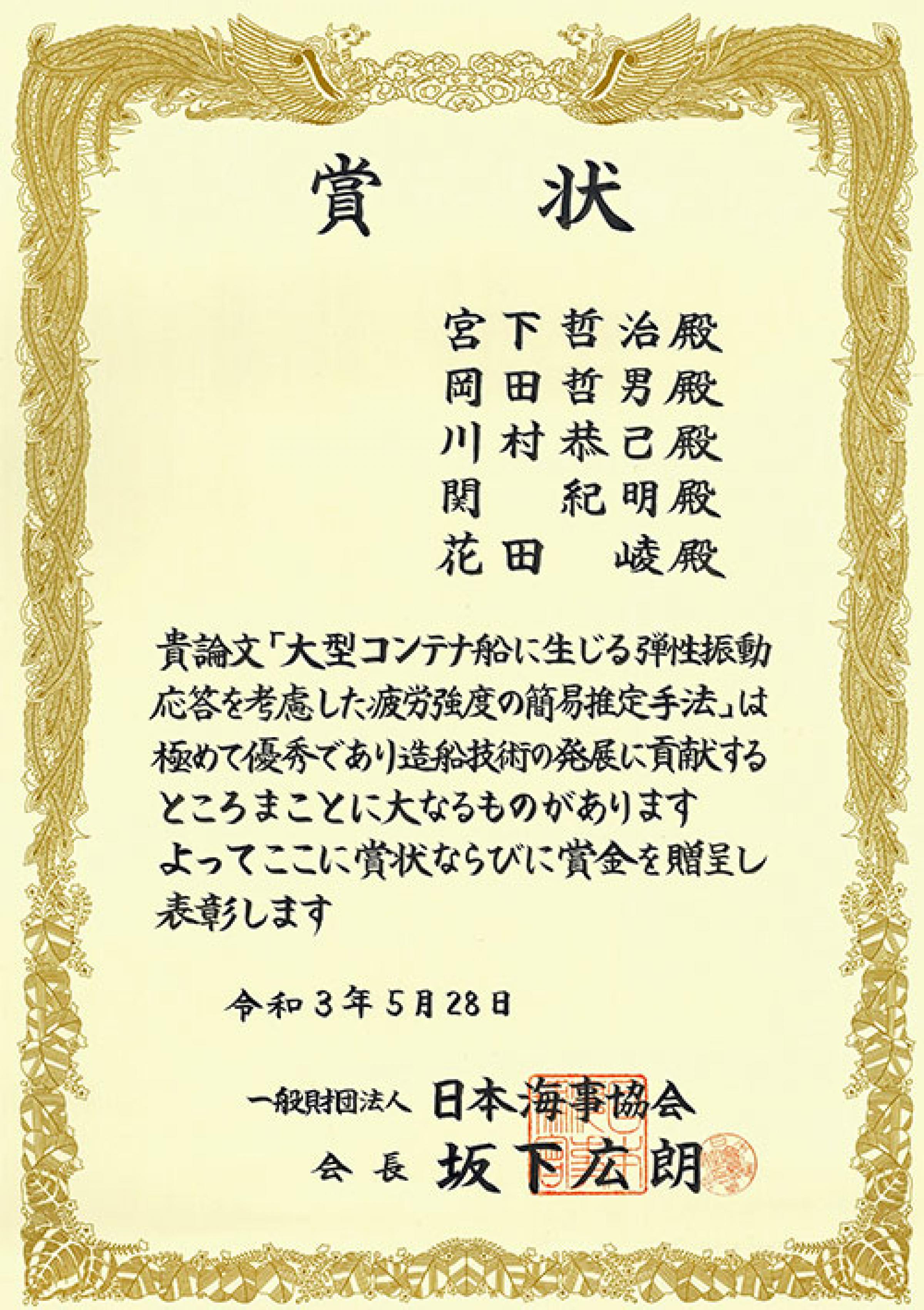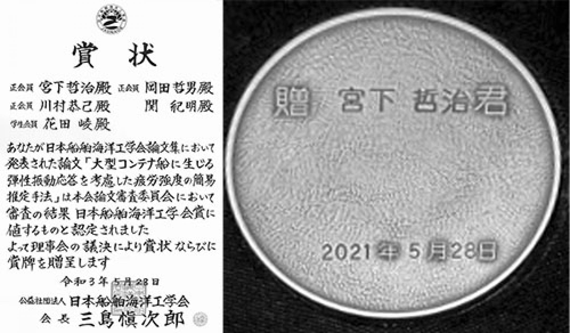 本賞は、造船造機・海洋工学等に関する優秀な論文に対して与えられるもので、宮下さん主著の論文「大型コンテナ船に生じる弾性振動応答を考慮した疲労強度の簡易推定手法」が次世代の設計手法の実現に大きく貢献するものと評価されました。