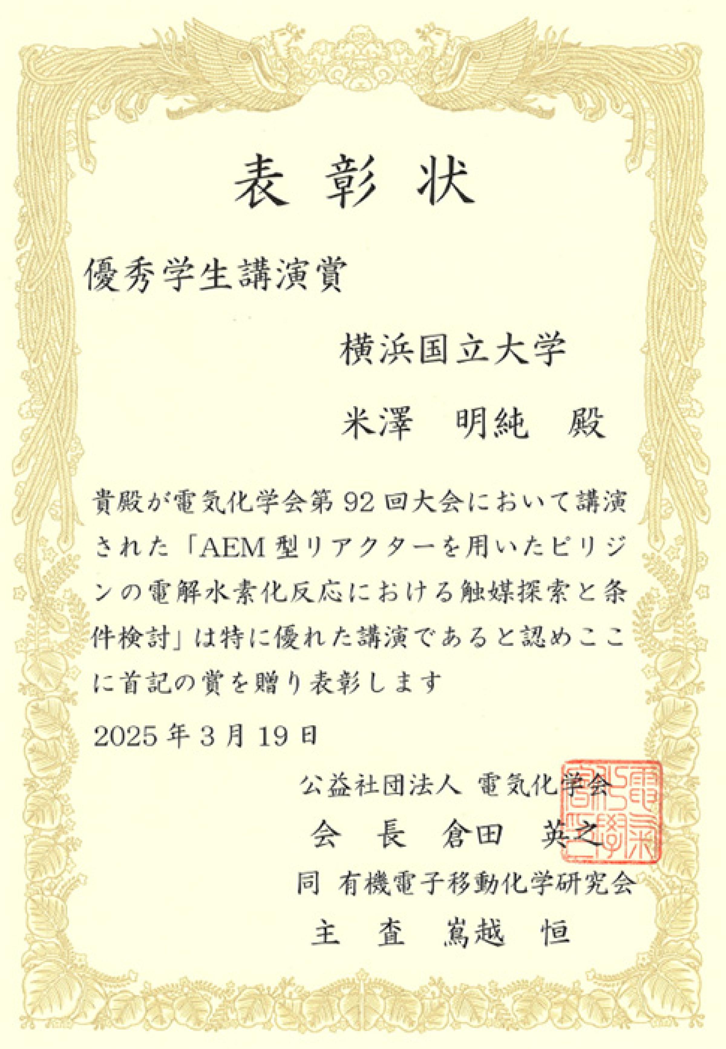 2025年 3月 18日~ 20日に、東京農工大学小金井キャンパスで開催された電気化学会第 92回大会において、大学院理工学府 博士課程前期 1年 米澤明純さん(指導教員:跡部真人 教授、信田尚毅 准教授)が発表した研究内容に対して、優秀学生講演賞が授与されました。