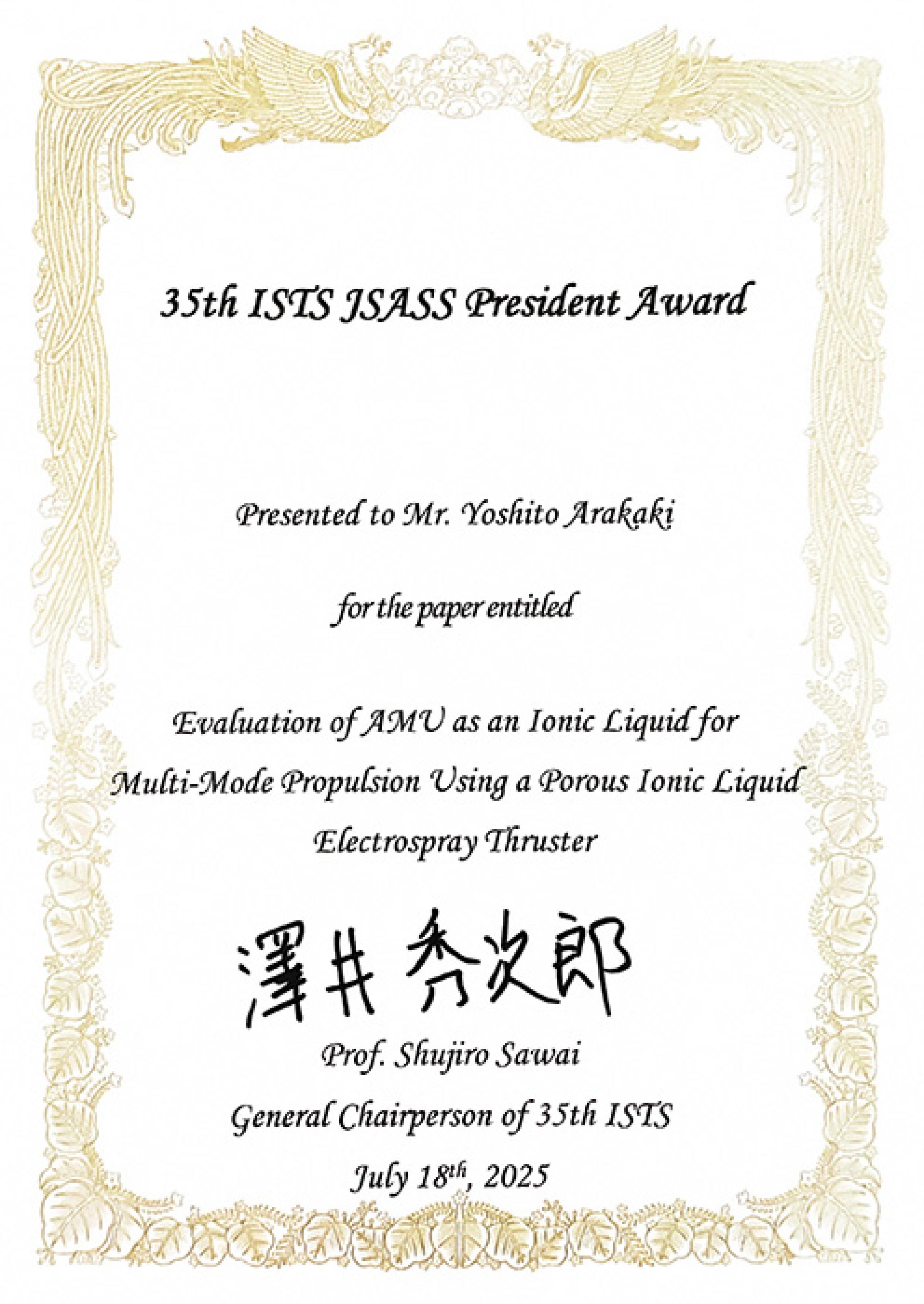 2025年 7月 14日~ 18日に徳島市で開催された 35th International Symposium on Space Technology and Science & 14th Nano-Satellite Symposium において、大学院理工学府特別研究学生(博士課程前期 2年)新垣善斗さん(指導教員:鷹尾祥典 教授/JAXA 月崎竜童 准教授)が研究内容とプレゼンテーション能力を高く評価された結果、JSASS President Award を受賞しました。受賞対象となった内容は以下の通りです。