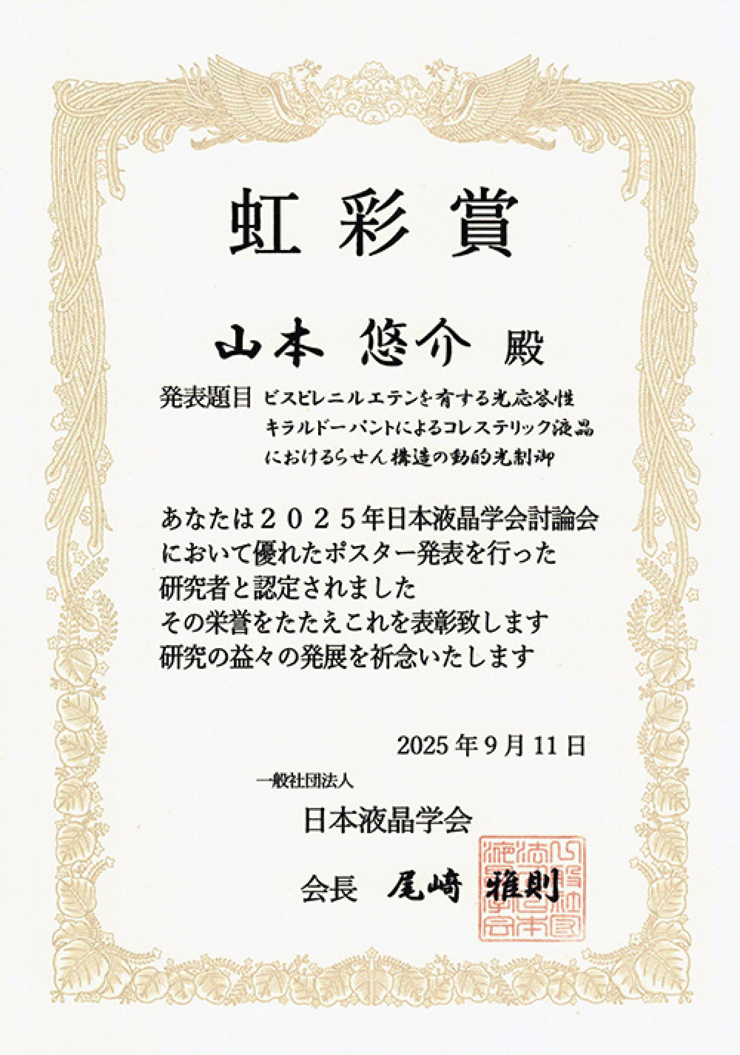 2025年 9月 10日(水)~ 12日(金) 京都市国際交流会館にて、2025年日本液晶学会討論会(主催:一般社団法人日本液晶学会)が開催され、理工学府 博士課程前期 2年山本悠介さん(指導教員:生方俊 准教授)が、虹彩賞を受賞しました。