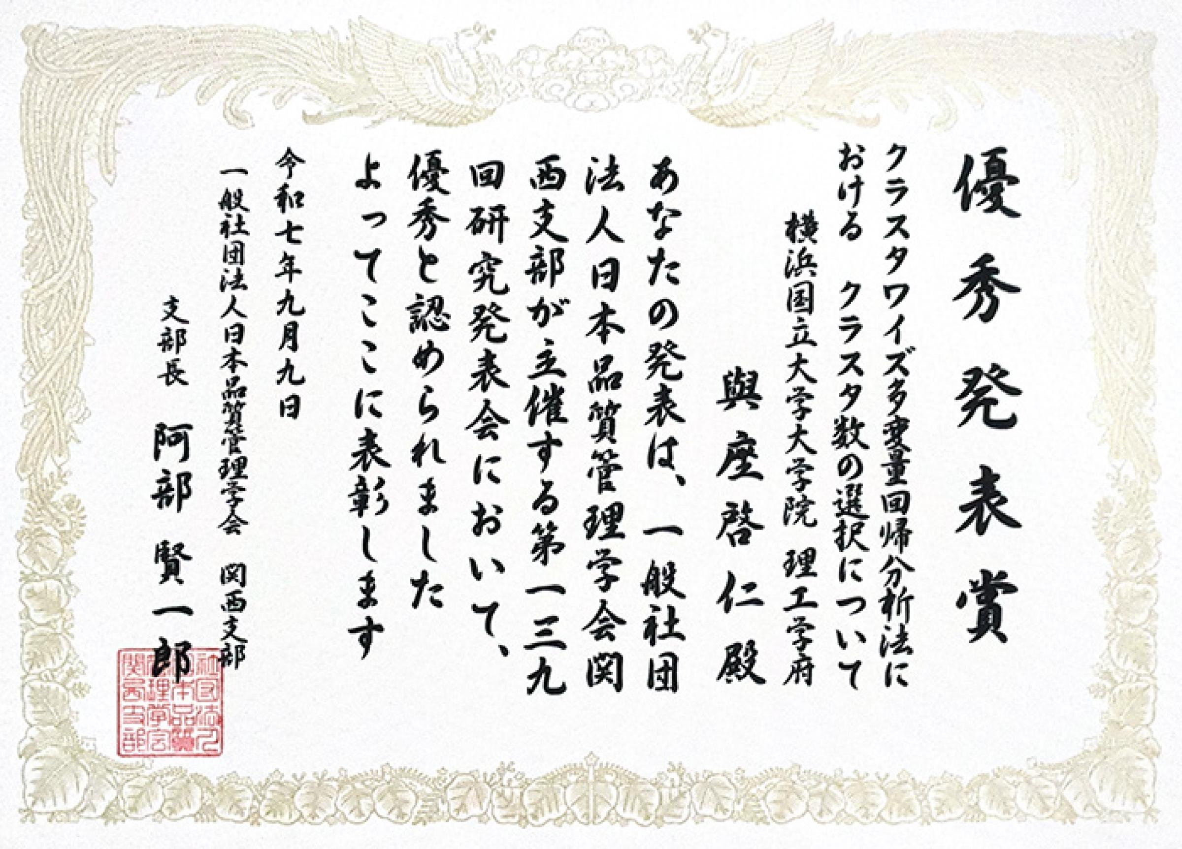 2025年 9月 9日に関西学院大学大阪梅田キャンパスで開催された日本品質管理学会 第139回研究発表会において、大学院理工学府 数物・電子情報系理工学専攻 数学教育分野 博士課程前期 2年の與座啓仁さん(指導教員:黒木学 教授)が、優秀発表賞を受賞しました。