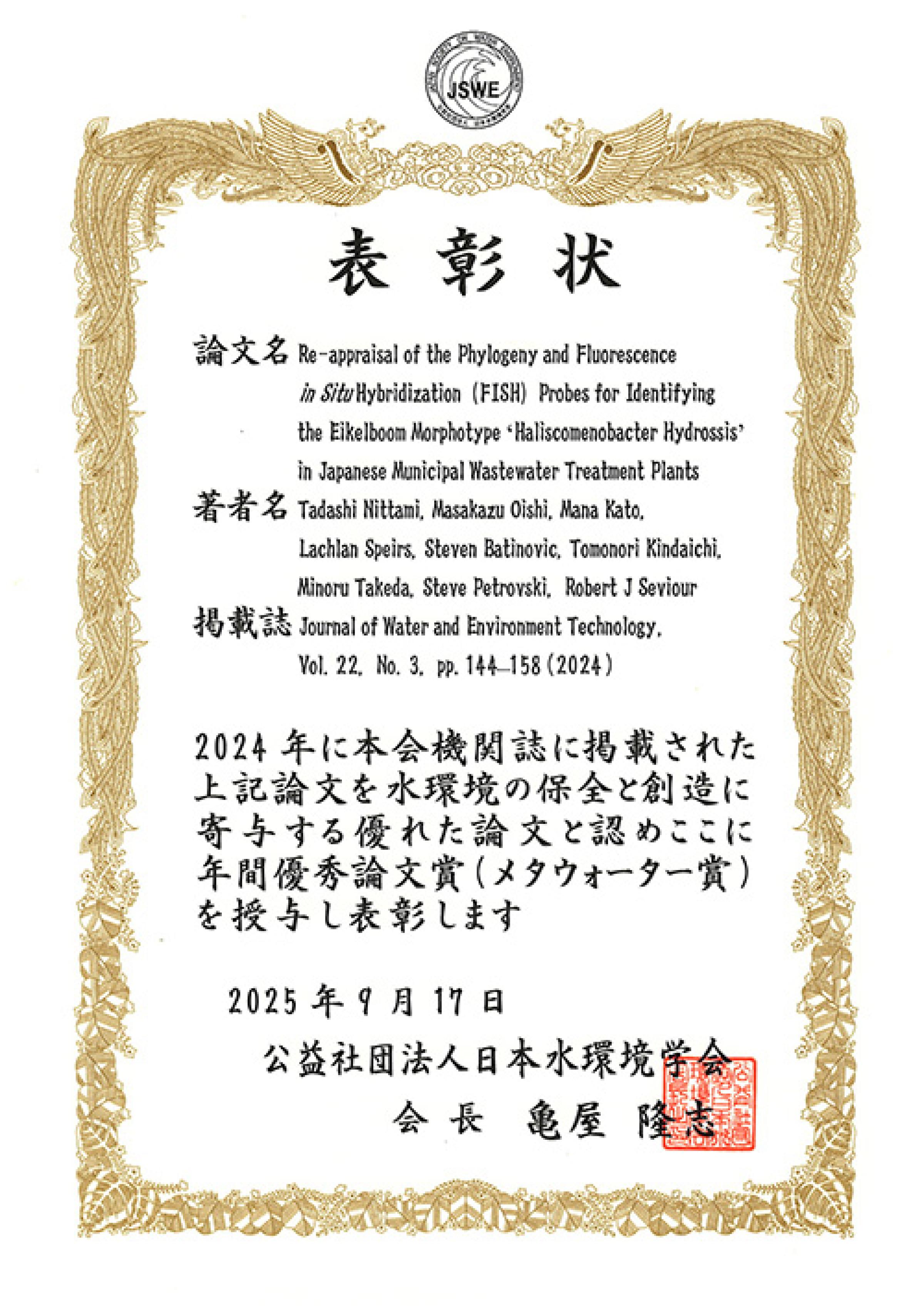 受賞論文の題目は「 Re-appraisal of the Phylogeny and Fluorescence in Situ Hybridization (FISH) Probes for Identifying the Eikelboom Morphotype ‘Haliscomenobacter Hydrossis’ in Japanese Municipal Wastewater Treatment Plants」です。