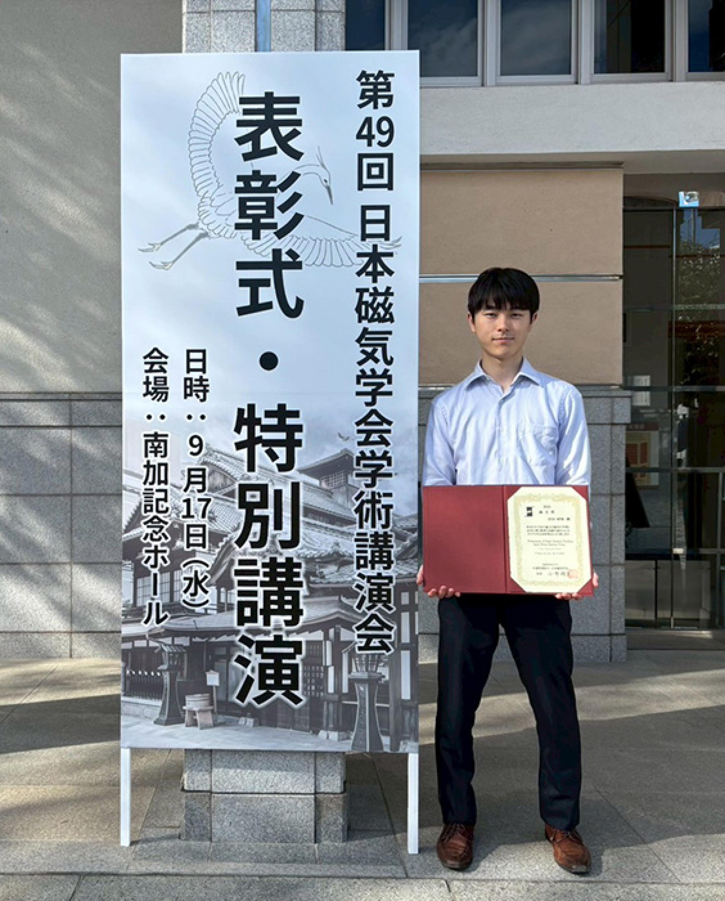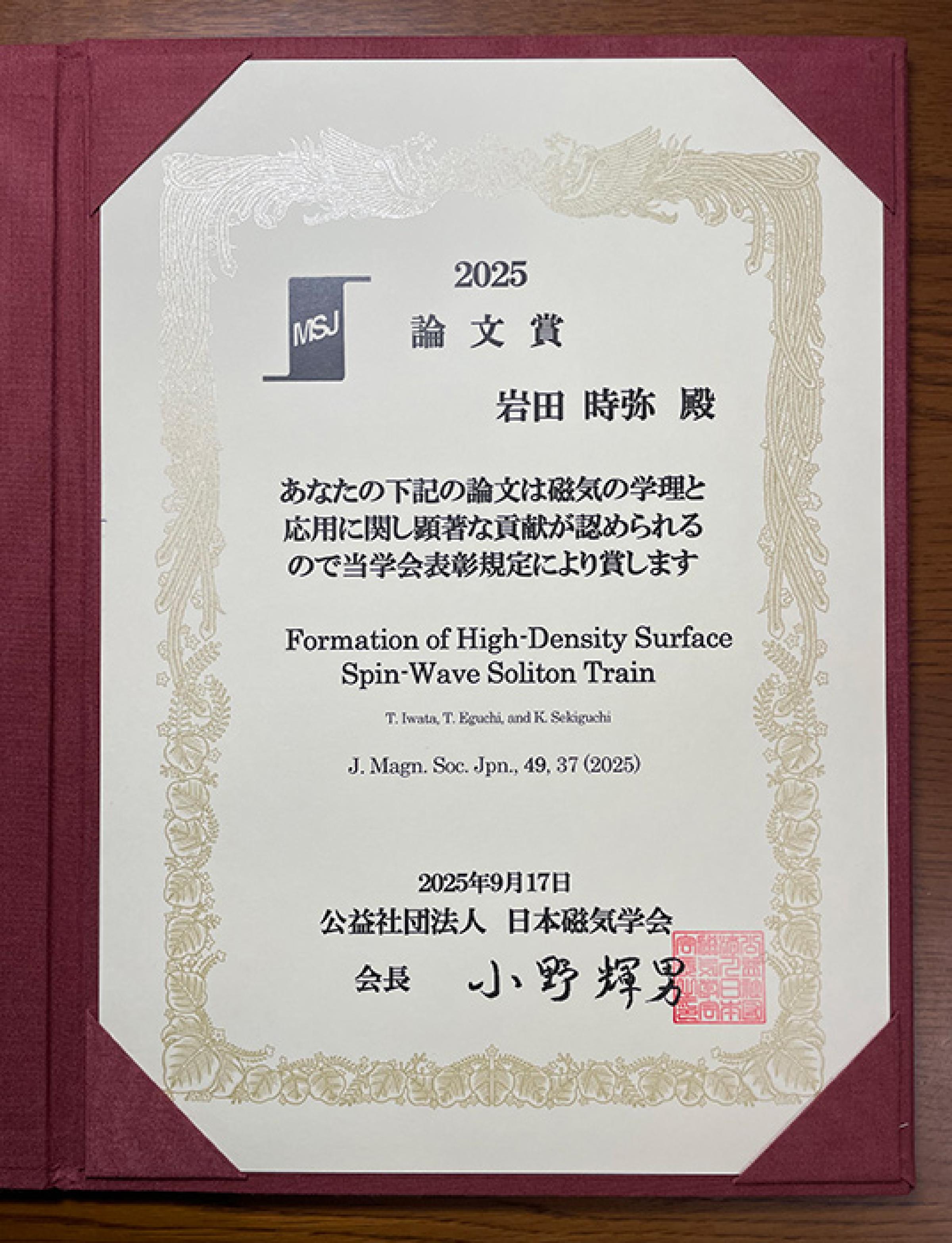 2025年 9月 16日~ 19日に愛媛大学で開催された 第49回 日本磁気学会学術講演会で、⼤学院理⼯学府 電子電気ネットワーク教育分野 博士課程前期 2年 岩田時弥さん(指導教員:関口康爾 教授)が、日本磁気学会(MSJ)より「論文賞」を受賞しました。
