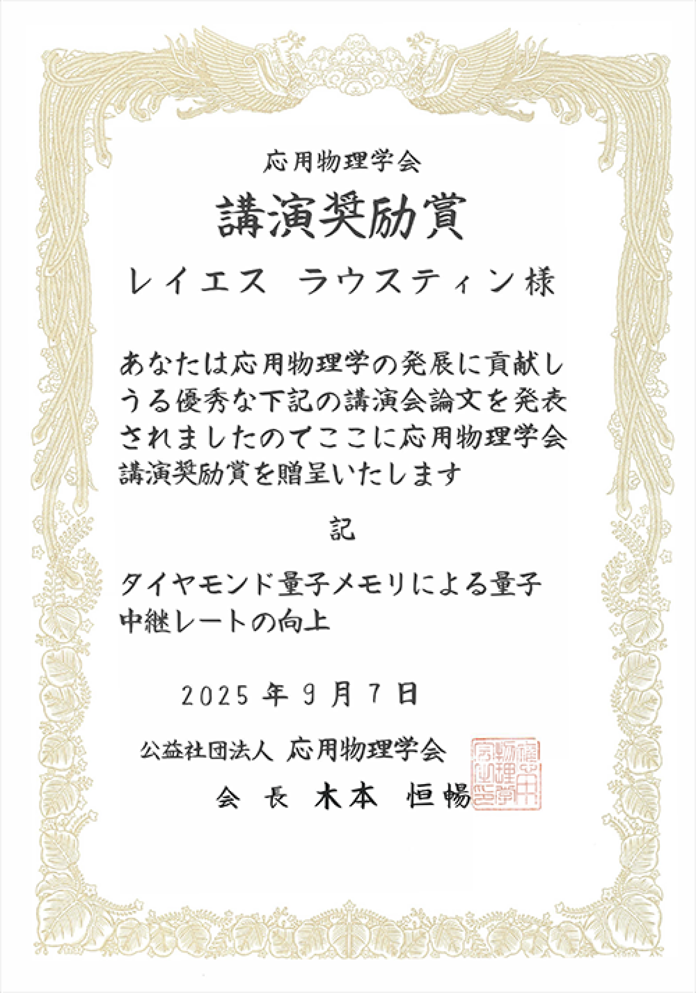 講演タイトルは「ダイヤモンド量子メモリによる発光吸収型量子中継」で、NV中心に存在する窒素スピン量子メモリに光子の情報を転写・保持しながら,もつれ光子の繰り返し発光を行うことによる量子中継レートの向上について報告しました。
