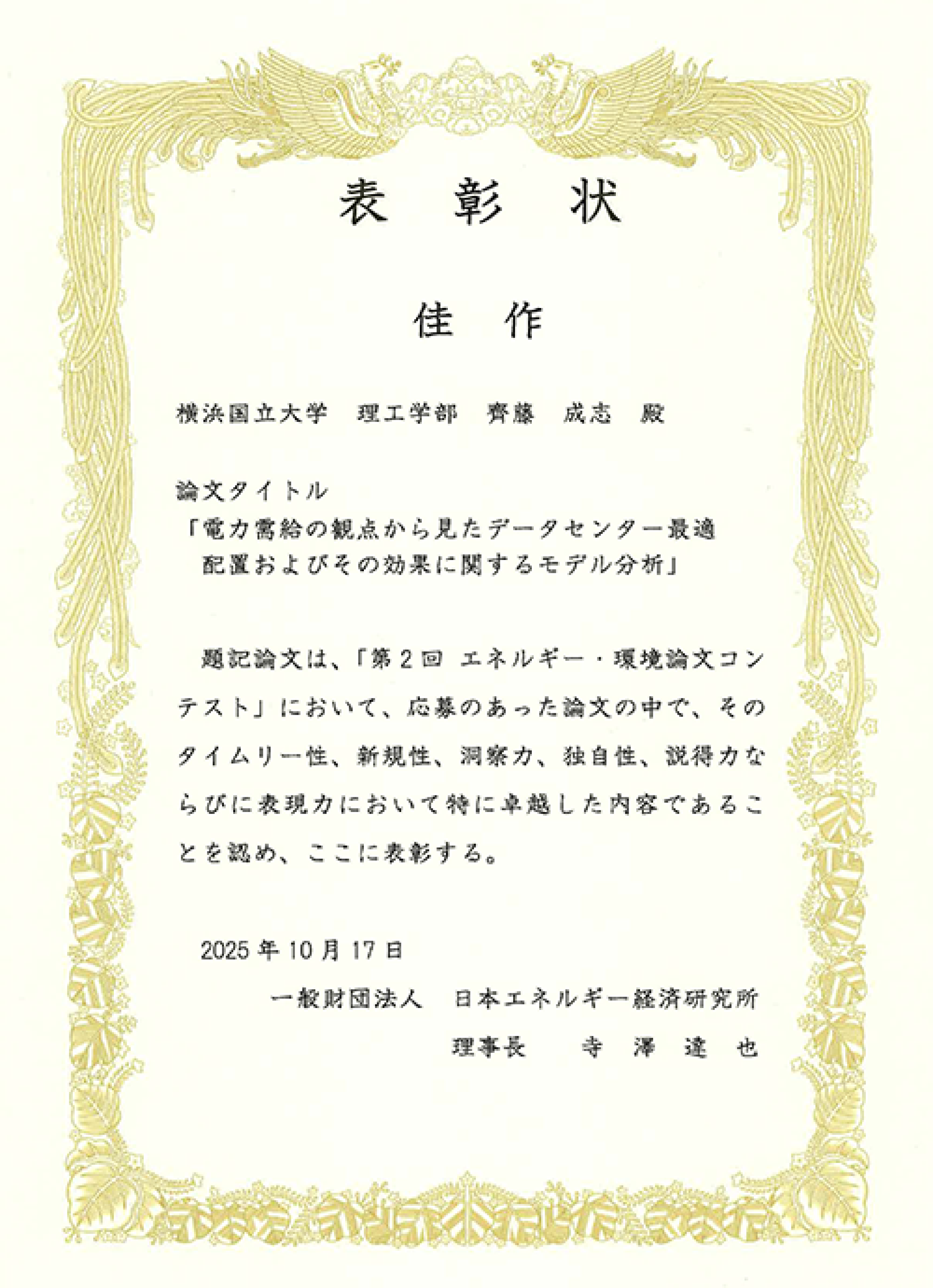 一般財団法人日本エネルギー経済研究所が主催する第 2回エネルギー・環境論文コンテストにて、理工学部 4年の齊藤成志さん(指導教員:大槻貴司 准教授)が「佳作」を受賞しました。