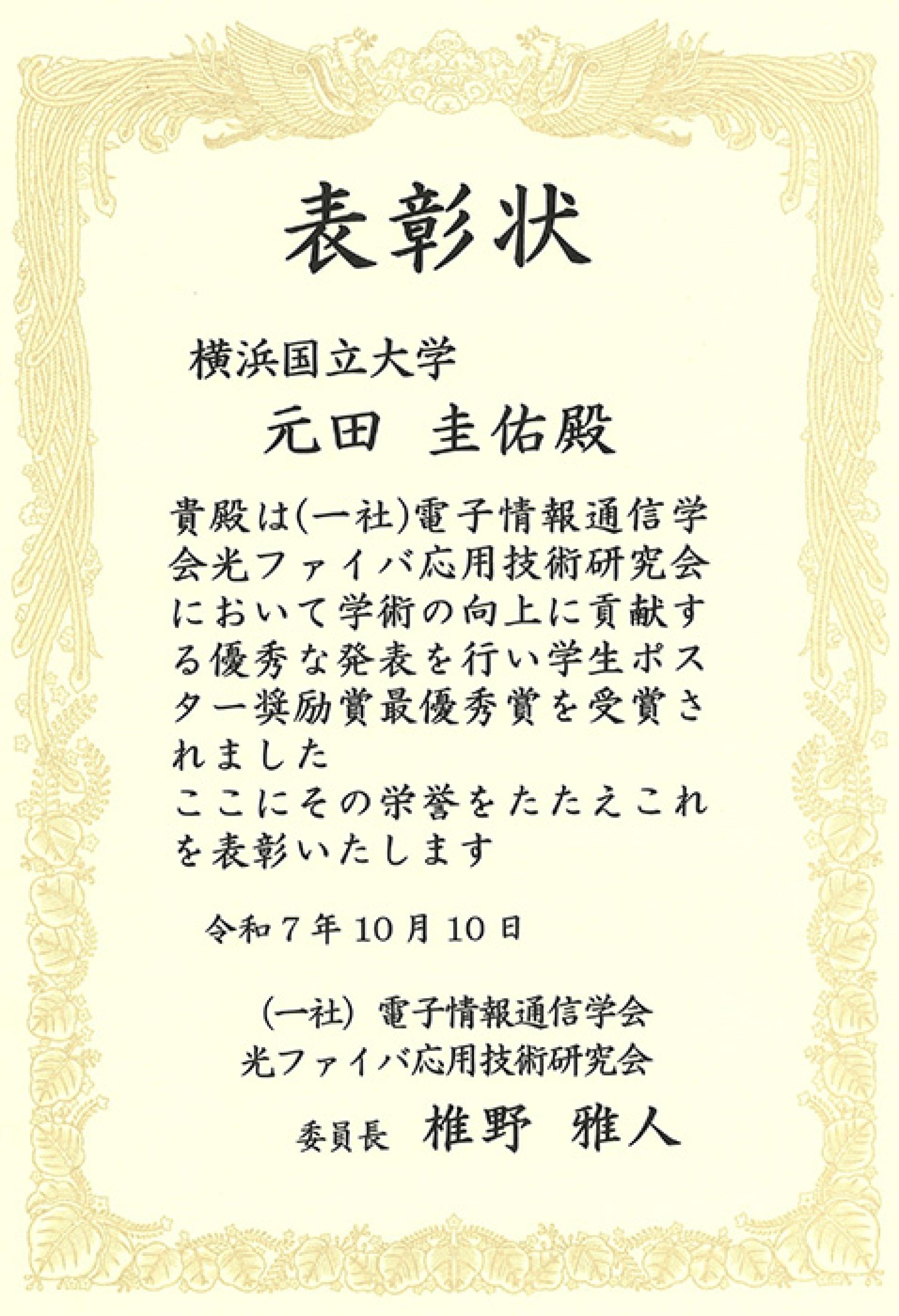 大学院理工学府博士課程前期 1年の元田圭佑さんと久保田晴之さん(指導教員:水野洋輔 准教授)が、2025年 10月 9日~ 10日に住友電気工業本社で開催された 2025年度 第3回 光ファイバ応用技術(OFT)研究会 にて、元田さんが「学生ポスター奨励賞 最優秀賞」を、久保田さんが「同 優秀賞」を受賞しました。