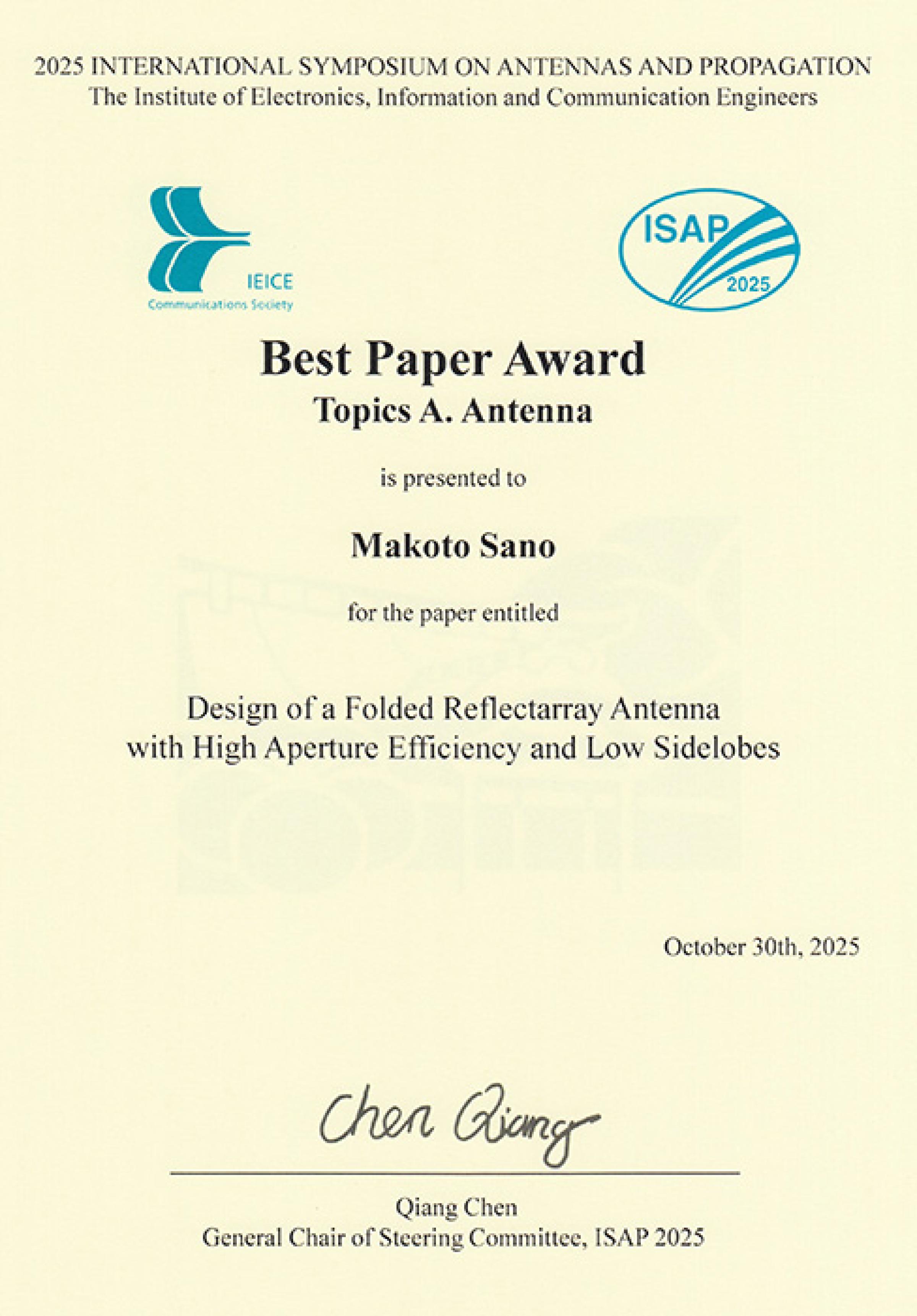 2025年10月27日〜31日に福岡において開催された国際会議「2025 International Symposium on Antennas and Propagation (ISAP2025)」において、大学院工学研究院の佐野誠准教授が「Best Paper Award」を受賞しました。