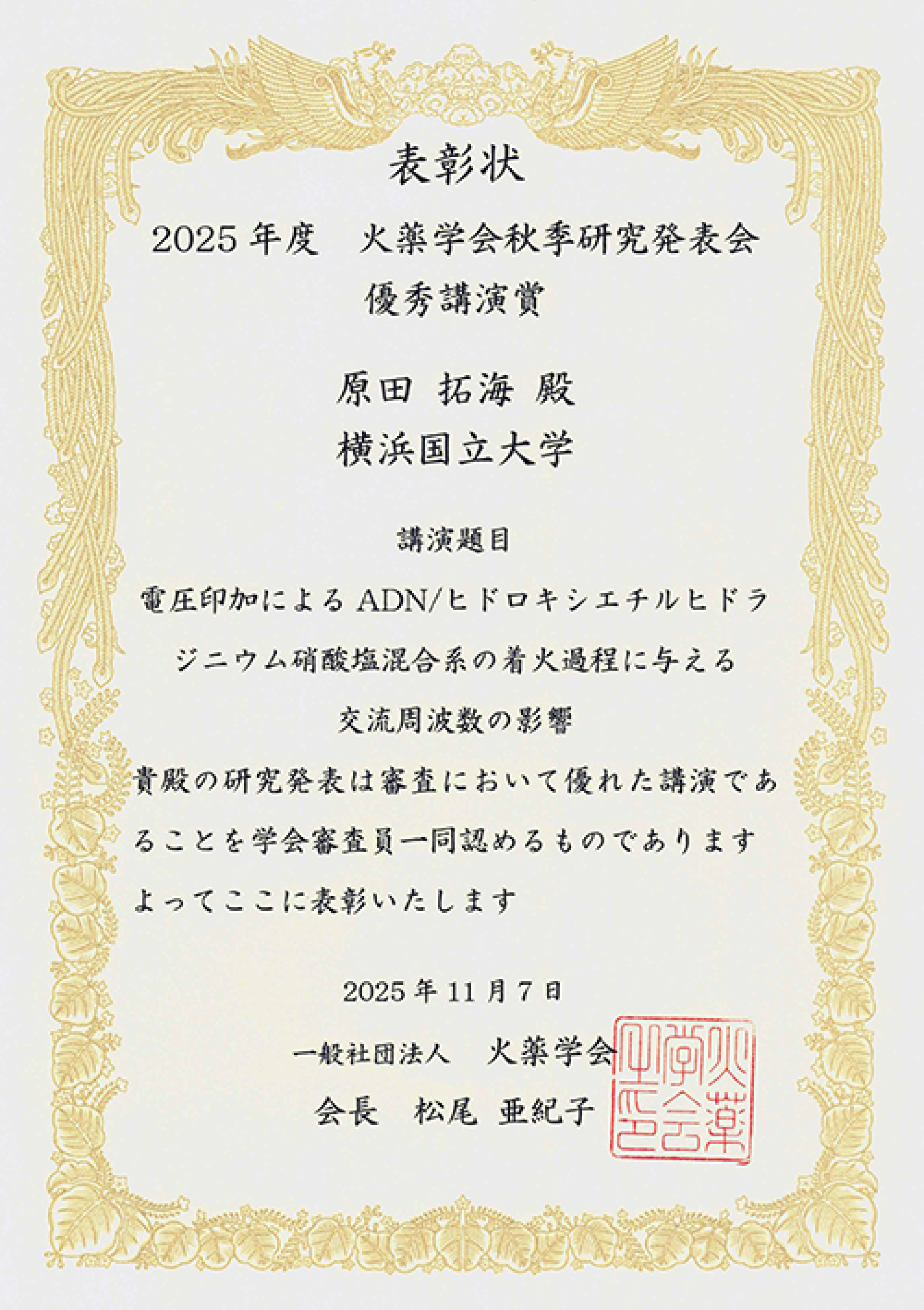 2025年 11月 6日~ 7日にかけて広島国際会議場で開催された 2025年度火薬学会秋季研究発表会において、理工学部 化学・生命系学科化学応用EP 4年生の原田拓海さん(指導教員:伊里友一朗 准教授)が優秀講演賞を受賞しました。本賞は審査委員会による審査を経て、特に優秀な講演であると評価を受けて受賞したものです。