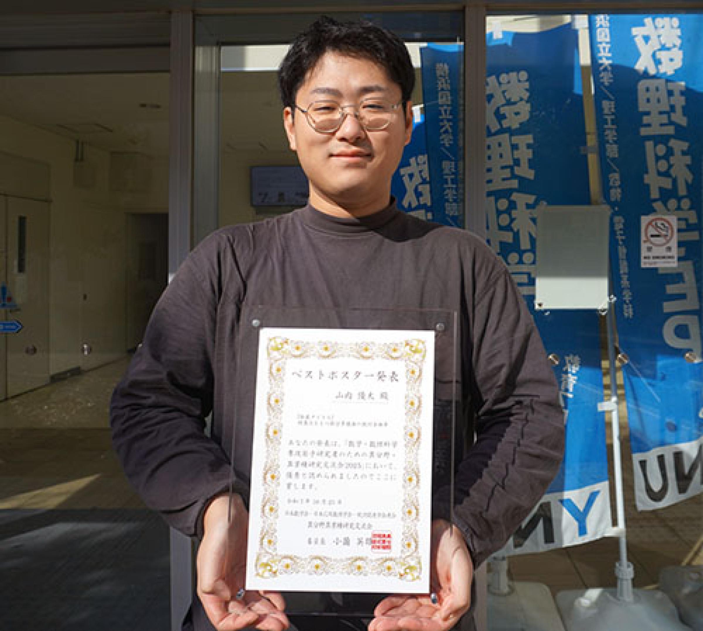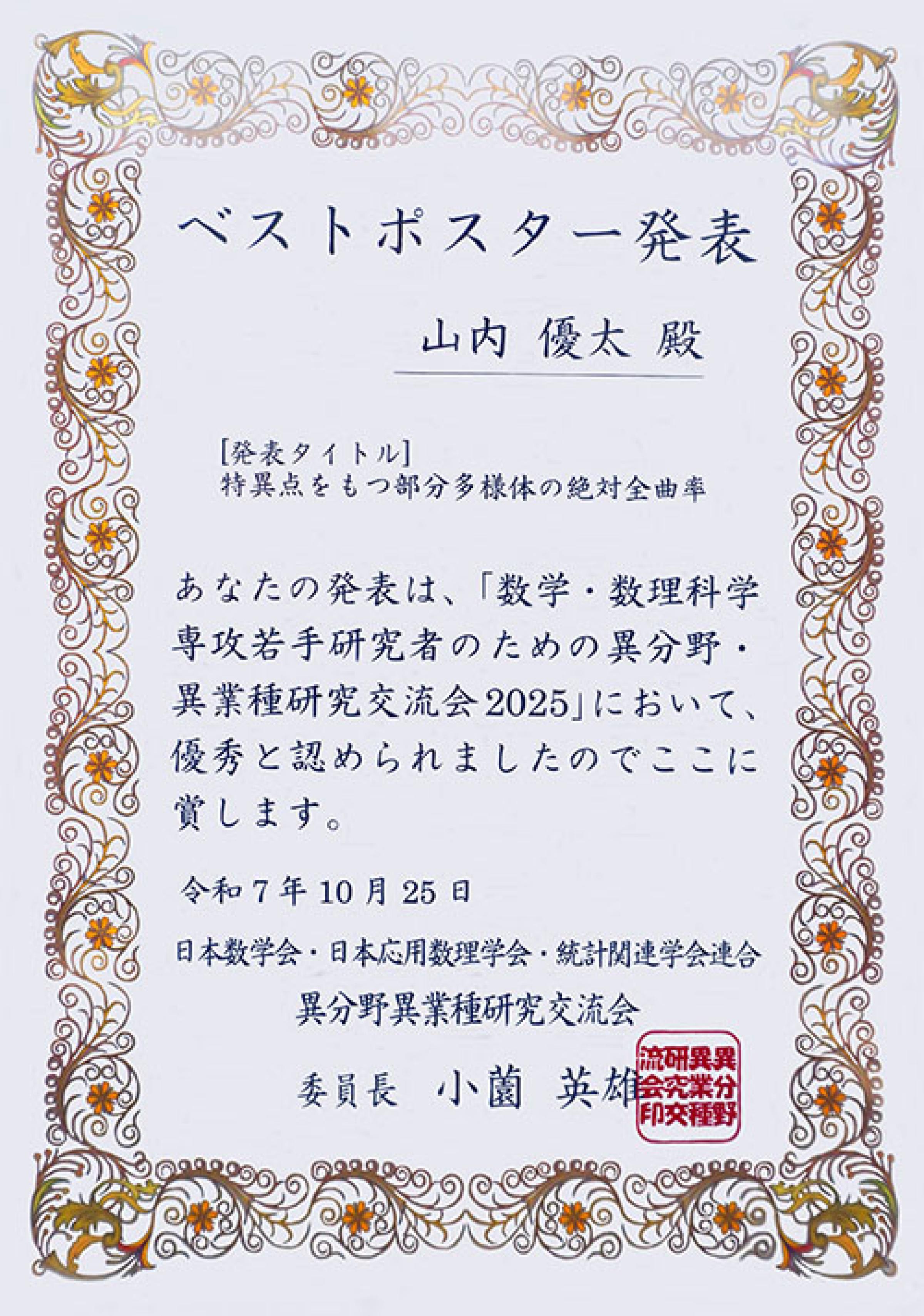 2025年 10月 25日に武蔵野大学で開催された「異分野異業種研究交流会2025」において、理工学府数物・電子情報系理工学専攻博士後期課程 2年の山内優太さん(指導教員:本田淳史 准教授)が、ベストポスター賞を受賞しました。