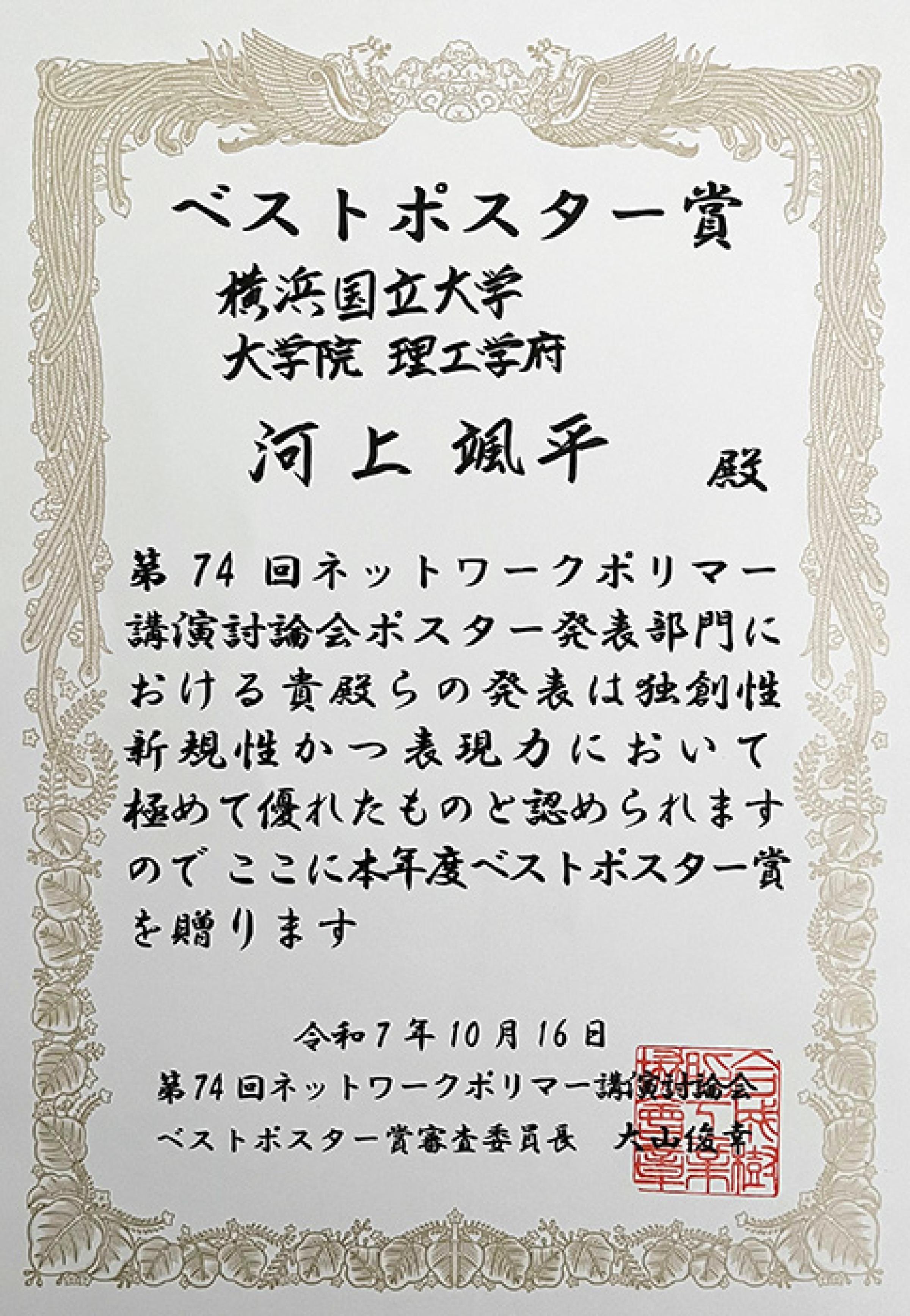 2025年 10月 15日~ 17日に KDDI維新ホール(山口県山口市)で開催された第 74回ネットワークポリマー講演討論会(主催:合成樹脂工業協会)において、大学院理工学府 博士課程前期 2年の河上颯平さん(指導教員:大山俊幸 教授、前川紘之 助教)が発表した研究内容に対して、ベストポスター賞が授与されました。
