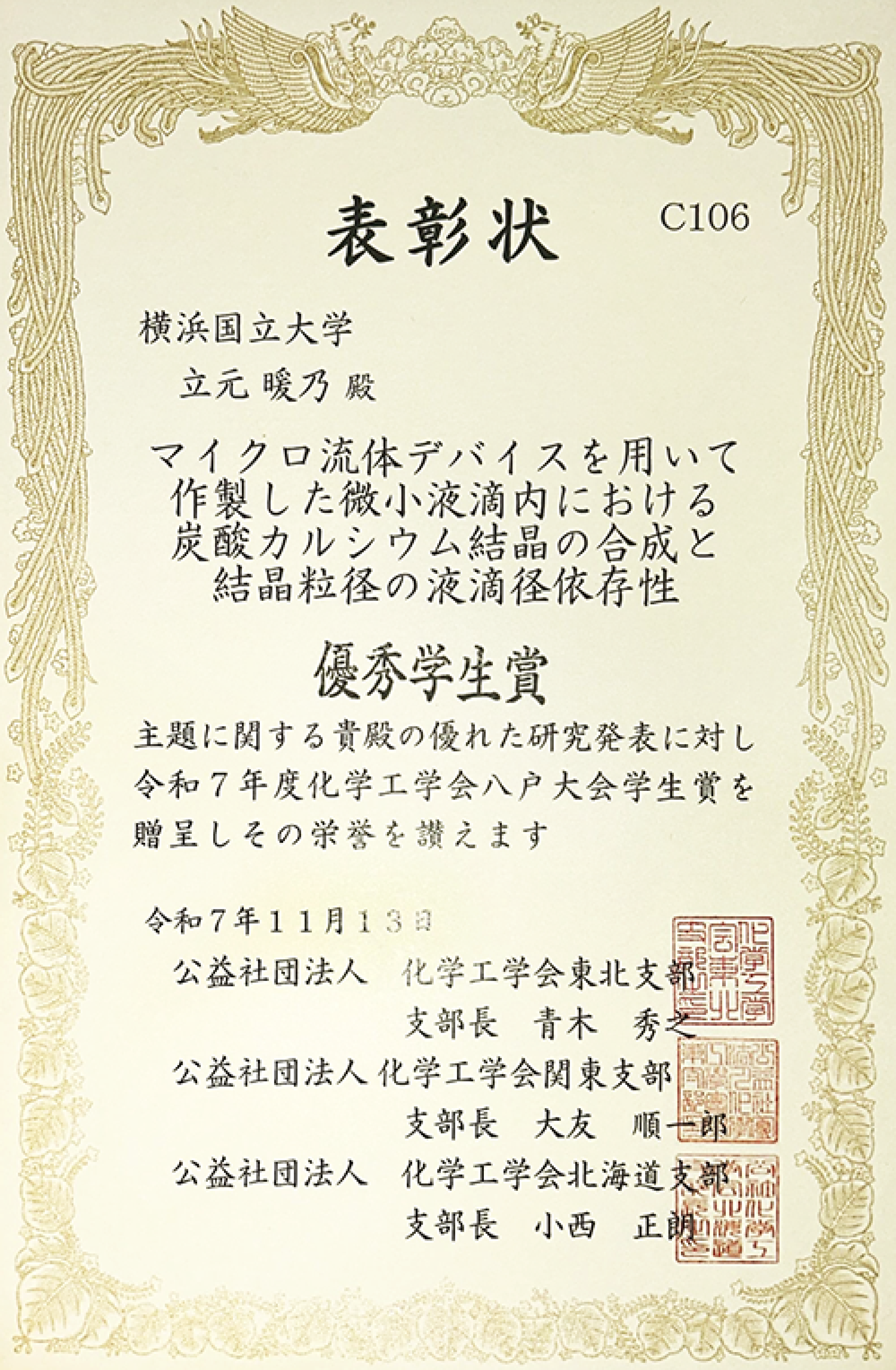 受賞講演題目は「マイクロ流体デバイスを用いて作製した微小液滴内における炭酸カルシウム結晶の合成と結晶粒径の液滴径依存性」です。同大会において研究発表を行った学生を対象に、審査員による 1次審査・ 2次審査が行われ、優れた研究発表として評価・選考され、受賞したものです。