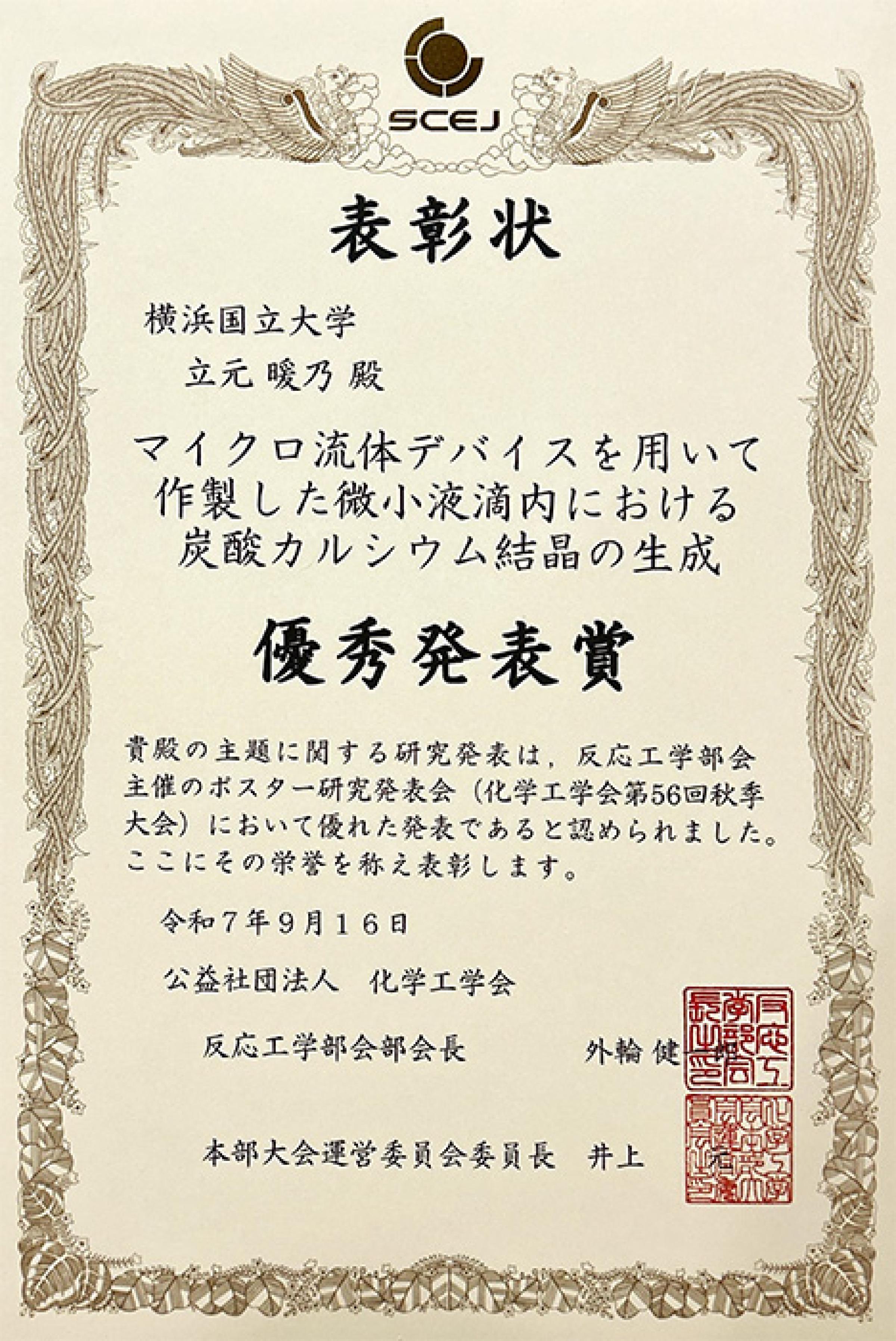 受賞講演題目は「マイクロ流体デバイスを用いて作製した微小液滴内における炭酸カルシウム結晶の生成」です。同大会の反応工学部会主催のポスター発表会において、優れた発表であると認められ、受賞しました。
