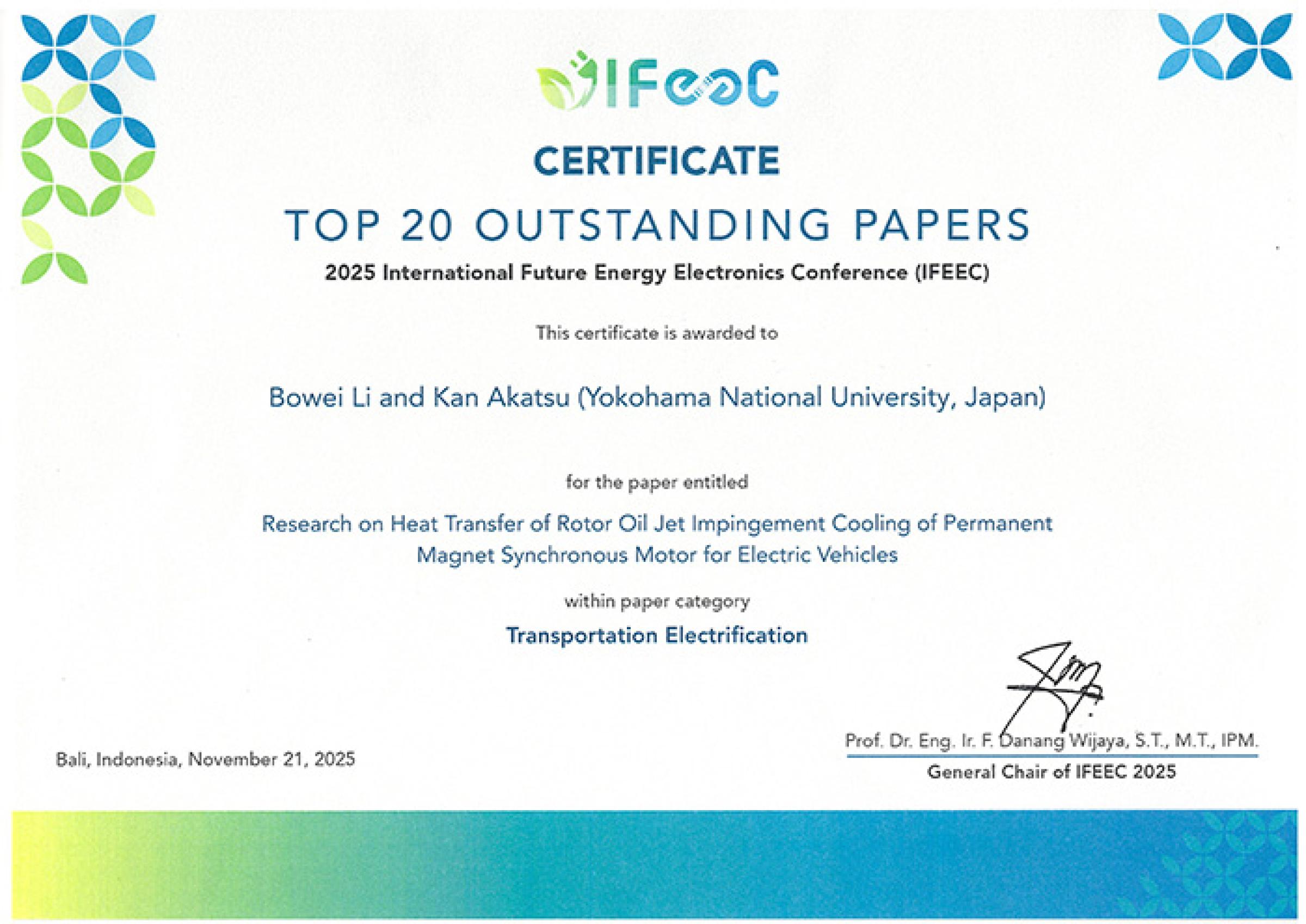 2025年 11月 20日〜 21日にインドネシアで開催された国際会議 IFEEC2025 において、大学院理工学府博士課程後期 3年の Bowei Liさん(指導教員:赤津観 教授)が Top 20 outstanding papers award を受賞しました。