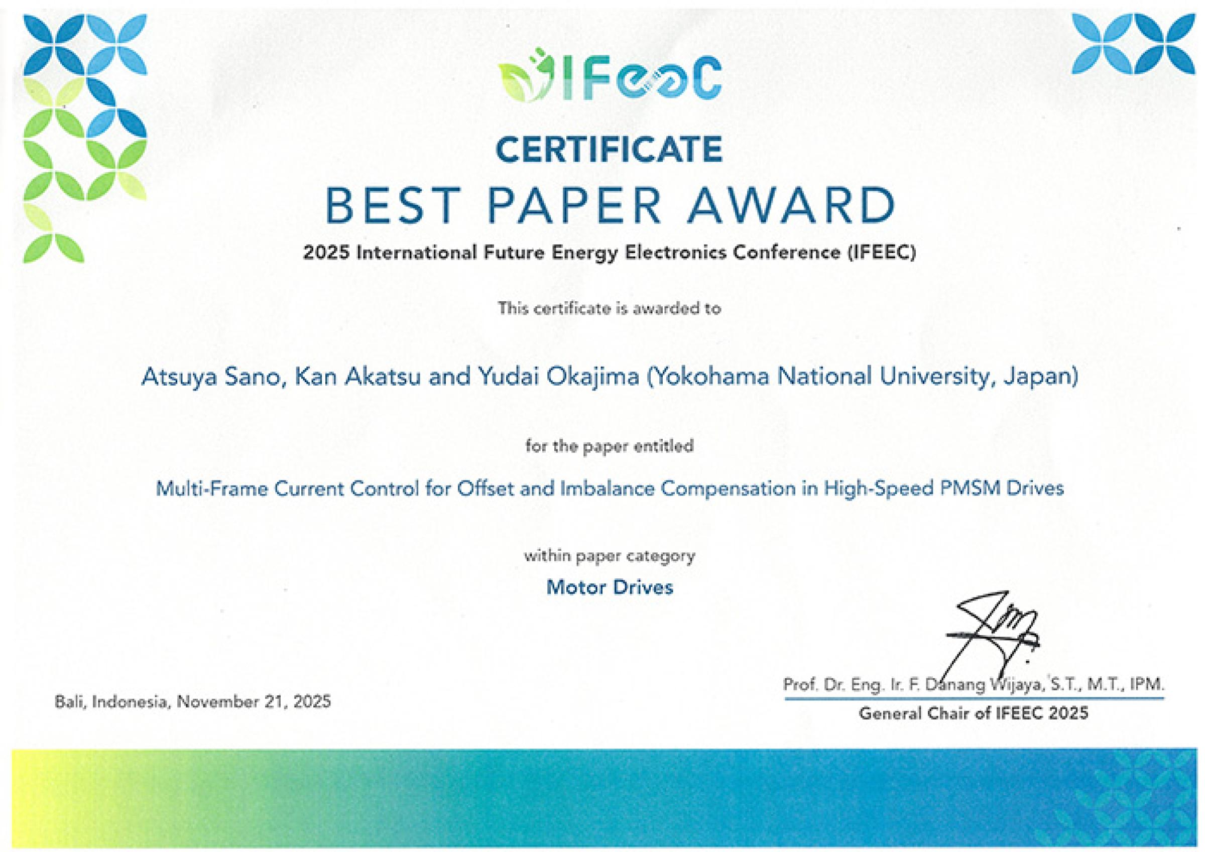 受賞論文の題目は Multi-Frame Current Control for Offset and Imbalance Compensation in High-Speed PMSM Drives です。