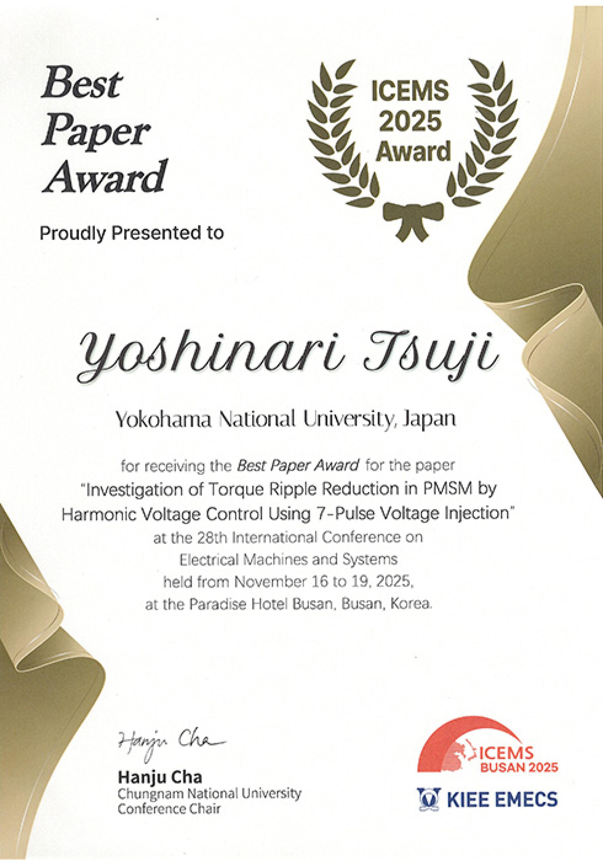 受賞論文の題目は Investigation of Torque Ripple Reduction in PMSM by Harmonic Voltage Control Using 7-Pulse Voltage Injection です。