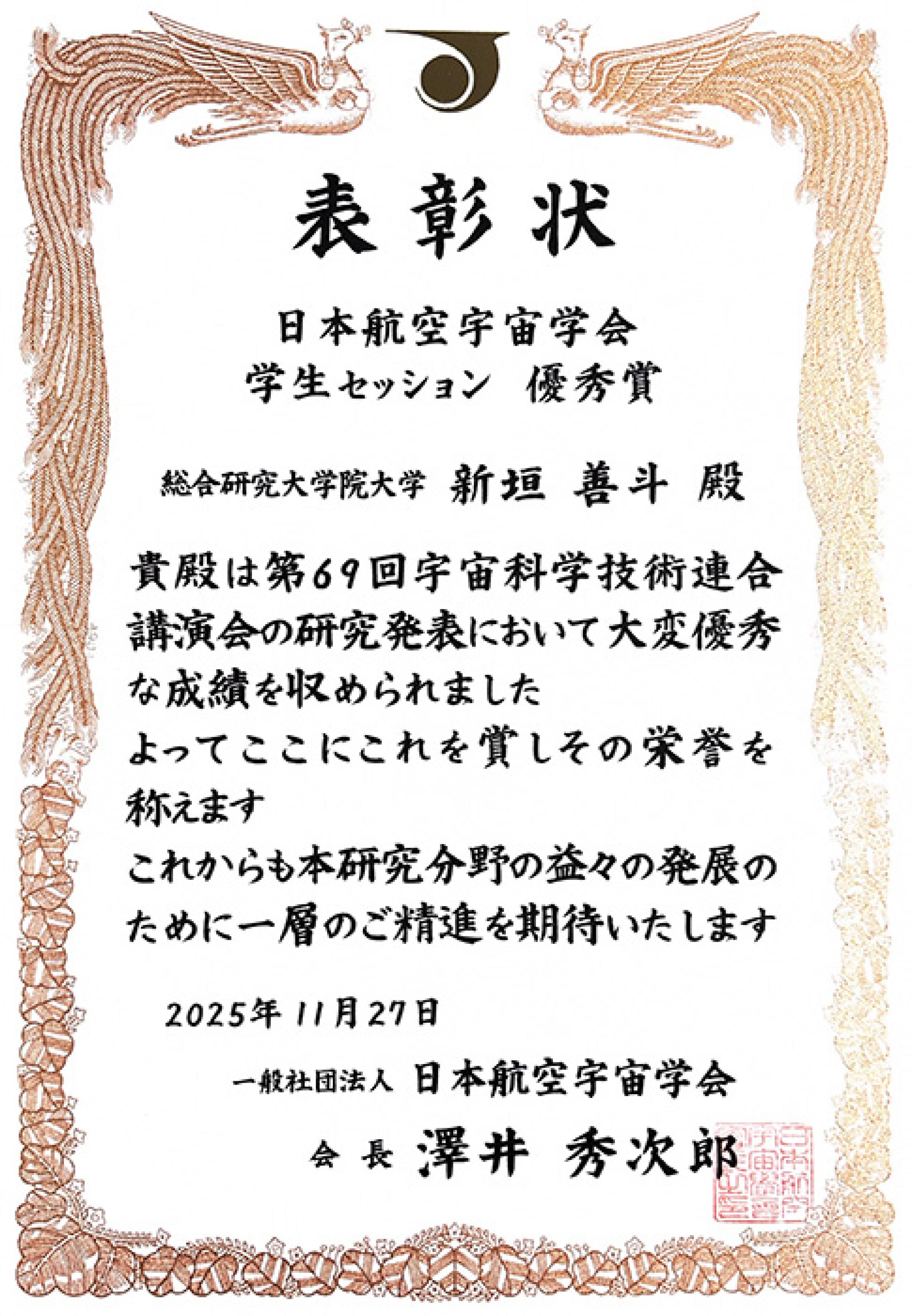 2025年 11月 25日~ 28日に北海道札幌市で開催された 第69回宇宙科学技術連合講演会において、大学院理工学府特別研究学生(博士課程前期 2年)新垣善斗さん(指導教員:鷹尾祥典 教授/JAXA 月崎竜童 准教授)が研究内容とプレゼンテーション能力を高く評価された結果、優秀賞を受賞しました。受賞対象となった内容は以下の通りです。