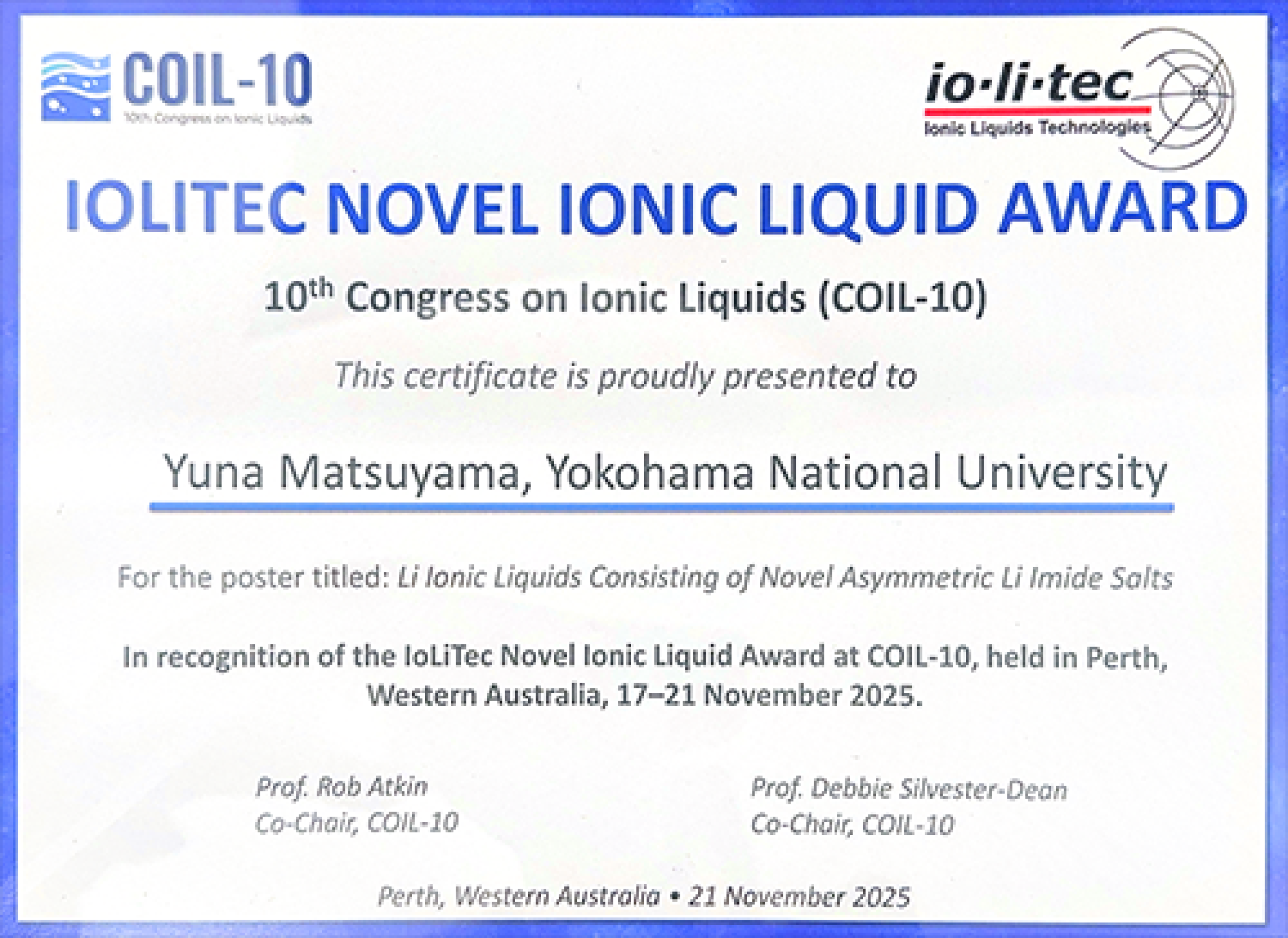 大学院理工学府 化学・生命系理工学専攻 エネルギー化学教育分野 博士課程前期 2年の松山由奈さん(指導教員:上野和英 教授)が、 2025年 11月 17日~ 21日にオーストラリア(パース)にて開催された The 10th International Congress on Ionic Liquids (COIL-10)において、「Li Ionic Liquids Consisting of Novel Asymmetric Li Imide Salts」というタイトルでポスター発表を行い Iolitec Novel Ionic Liquid Awardを受賞しました。