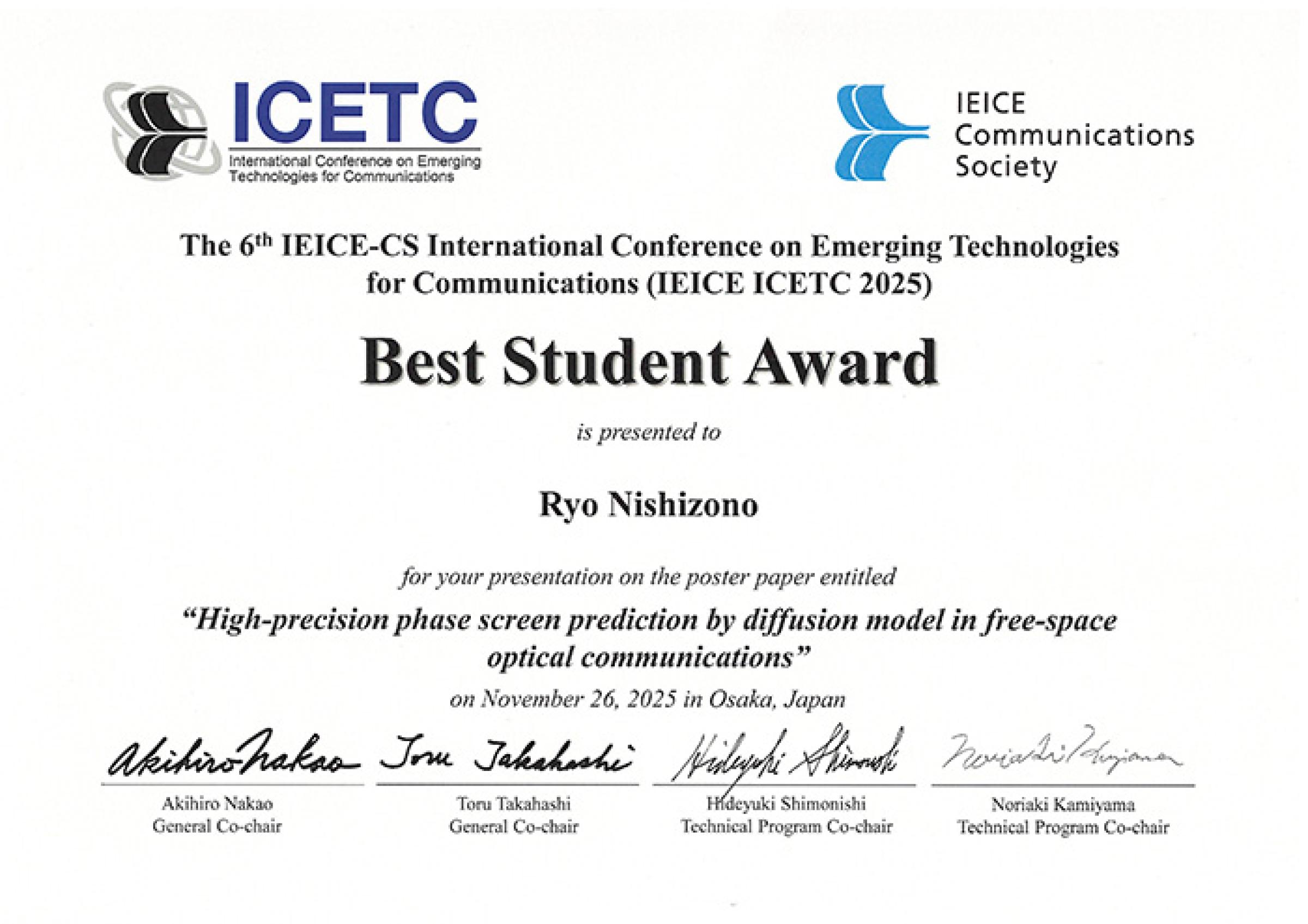 2025年 11月 26日〜 28日に大阪で開催された国際会議 ICETC2025 において、大学院理工学府博士課程前期 2年の西薗遼さん(指導教員:小島駿 助教)が Best Student Award を受賞しました。