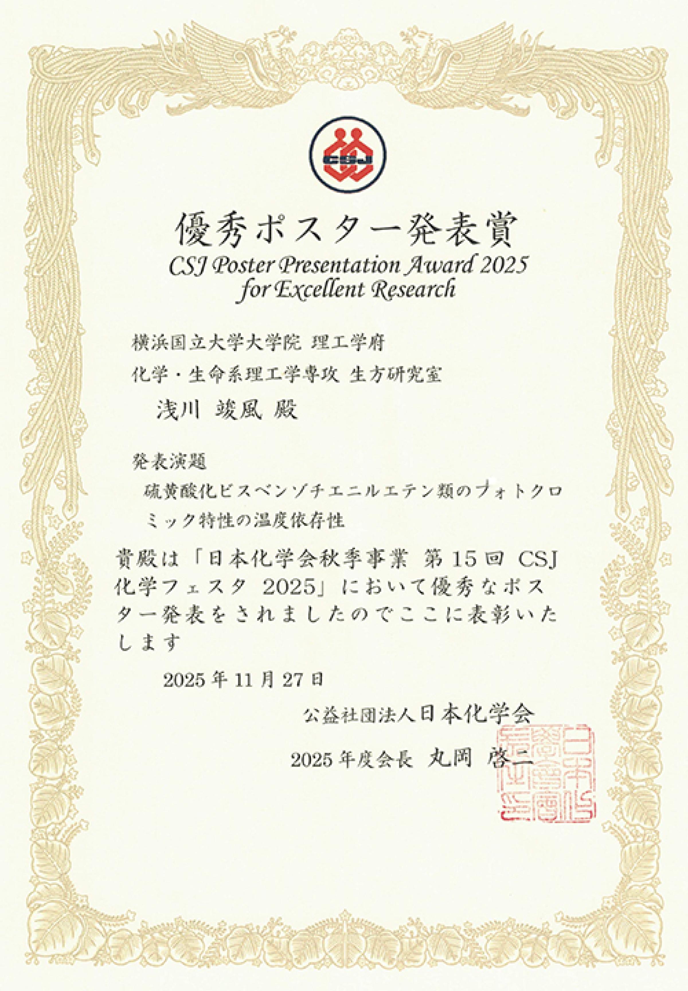 2025年 10月 22日(水)~ 24日(金) タワーホール船堀にて、第 15回 CSJ化学フェスタ 2025が開催され、理工学府 博士課程前期1年浅川竣風さん(指導教員:工学研究院 生方俊 准教授)が、優秀ポスター発表賞を受賞しました。