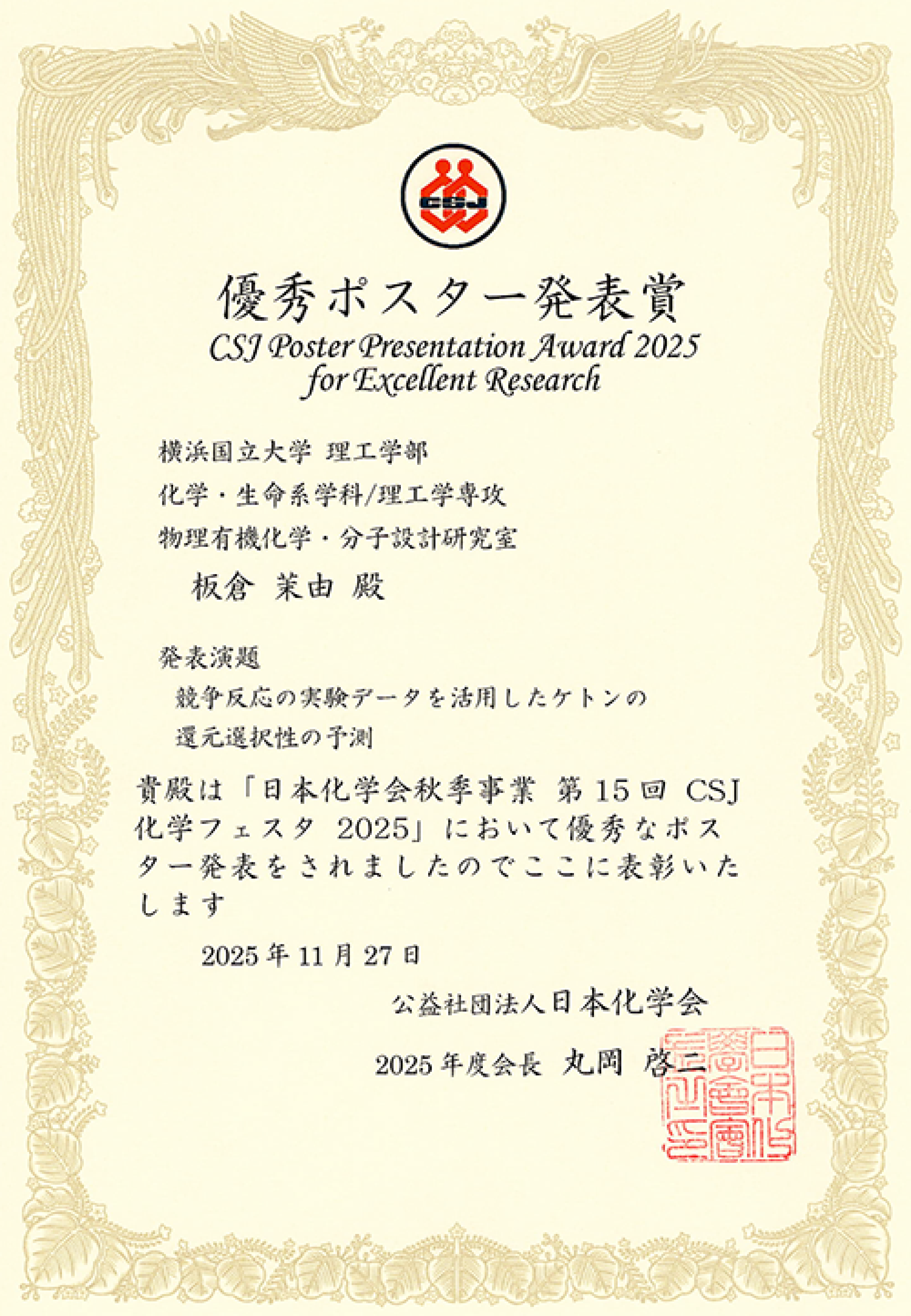 2025年 10月 22日〜 24日にタワーホール船堀で開催された、第 15回CSJ化学フェスタ2025で、理工学部 化学・生命系学科 化学EP 4年の板倉茉由さん(指導教員:五東弘昭 准教授)が、優秀ポスター発表賞を受賞しました。受賞発表のタイトルは、「競争反応の実験データを活用したケトンの還元選択性の予測」です。
