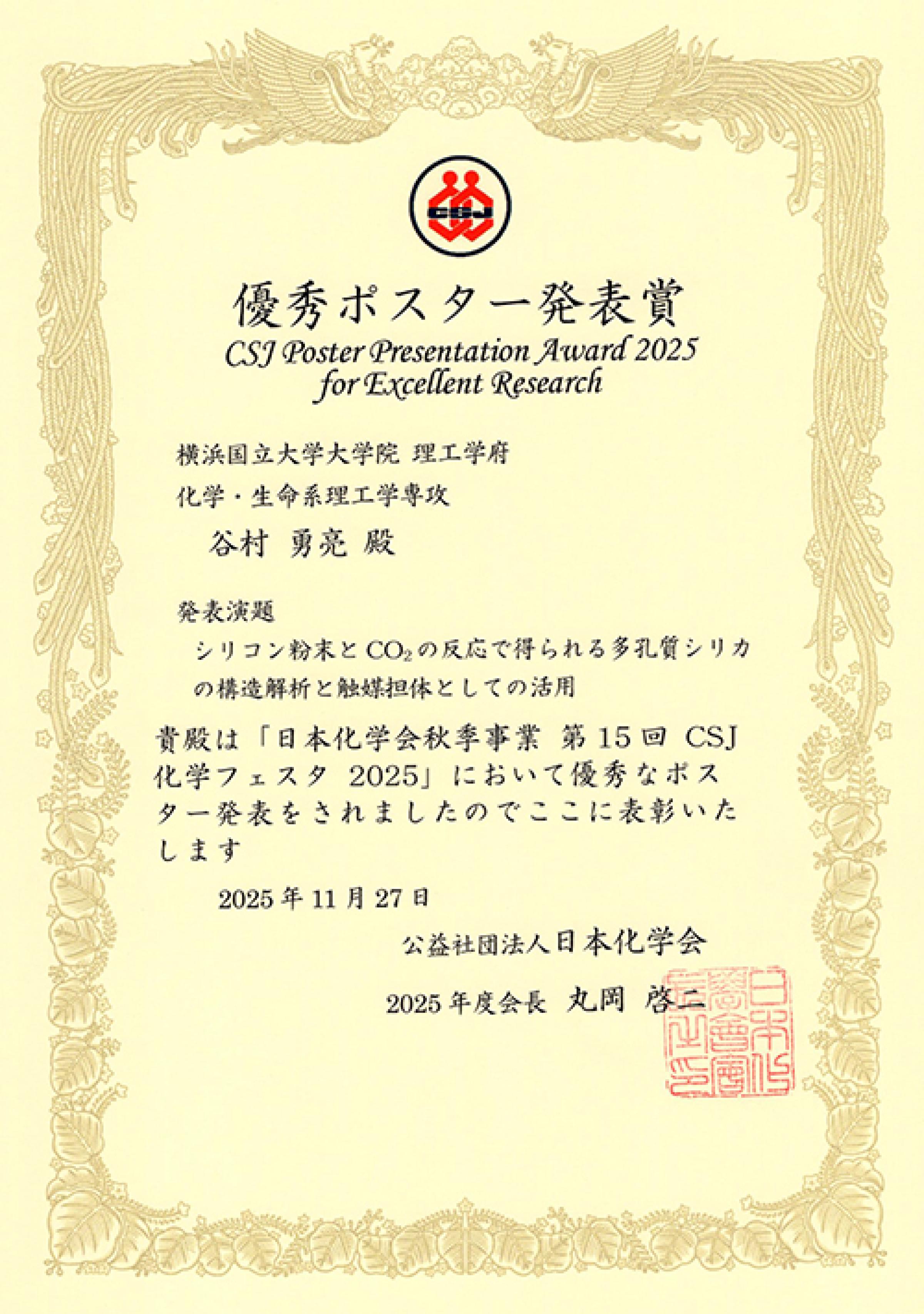 二酸化炭素とシリコンとの反応で得られる多孔質シリカの構造解析・生成機構の解明と、 CO2変換触媒のための担体としての活用に関する研究成果をポスター発表し、その内容が高く評価されました。