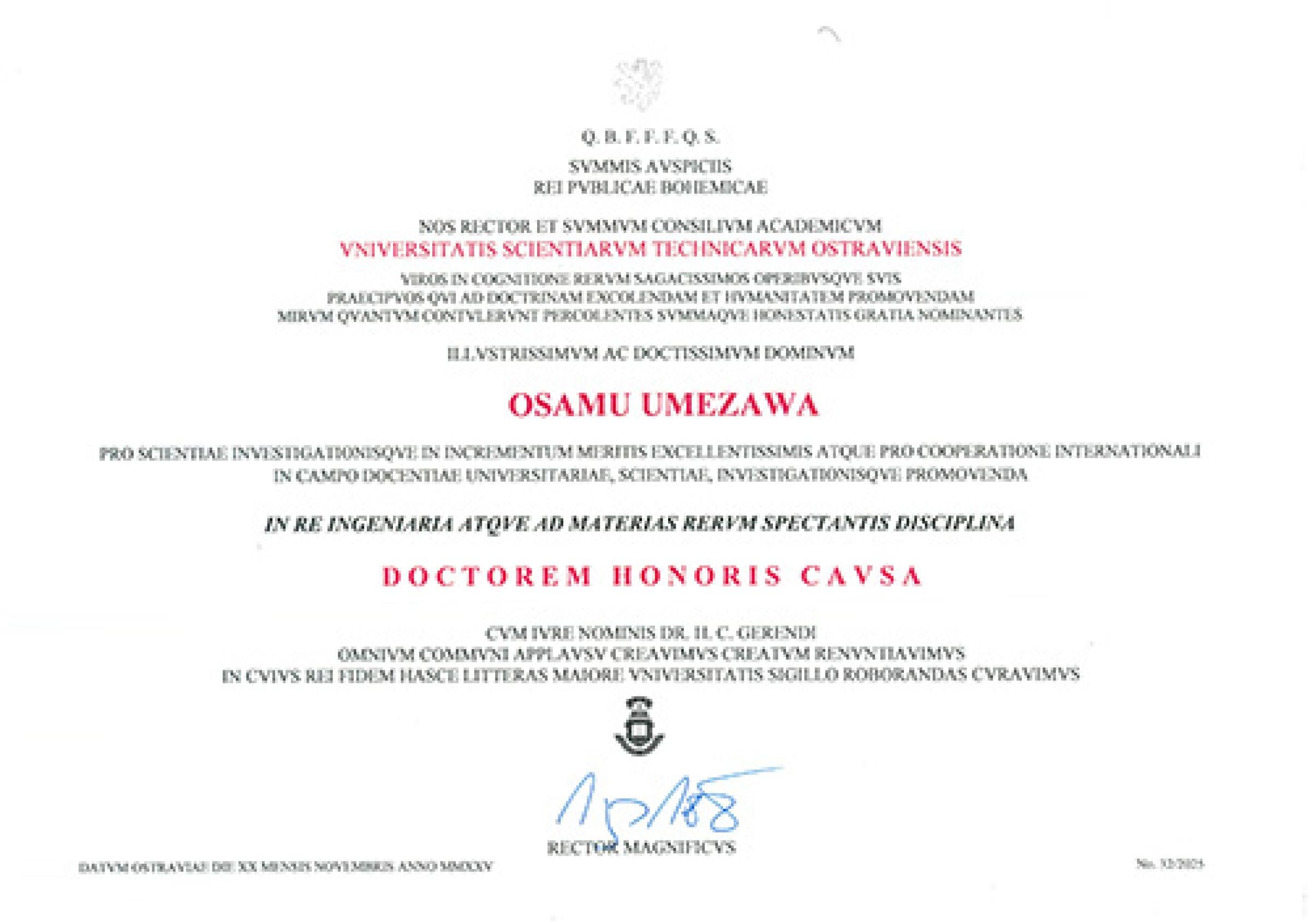 2025年 11月 20日にチェコ共和国 VYSOKÁ ŠKOLA BÁŇSKÁ – TECHNICKÁ UNIVERZITA OSTRAVA(オストラバ工科大学)で贈呈式(Ceremonial Meeting of the Scientific Council)が行われ、大学院工学研究院 梅澤修教授に Doctor Honoris Causa(名誉博士)の称号が授与されました。