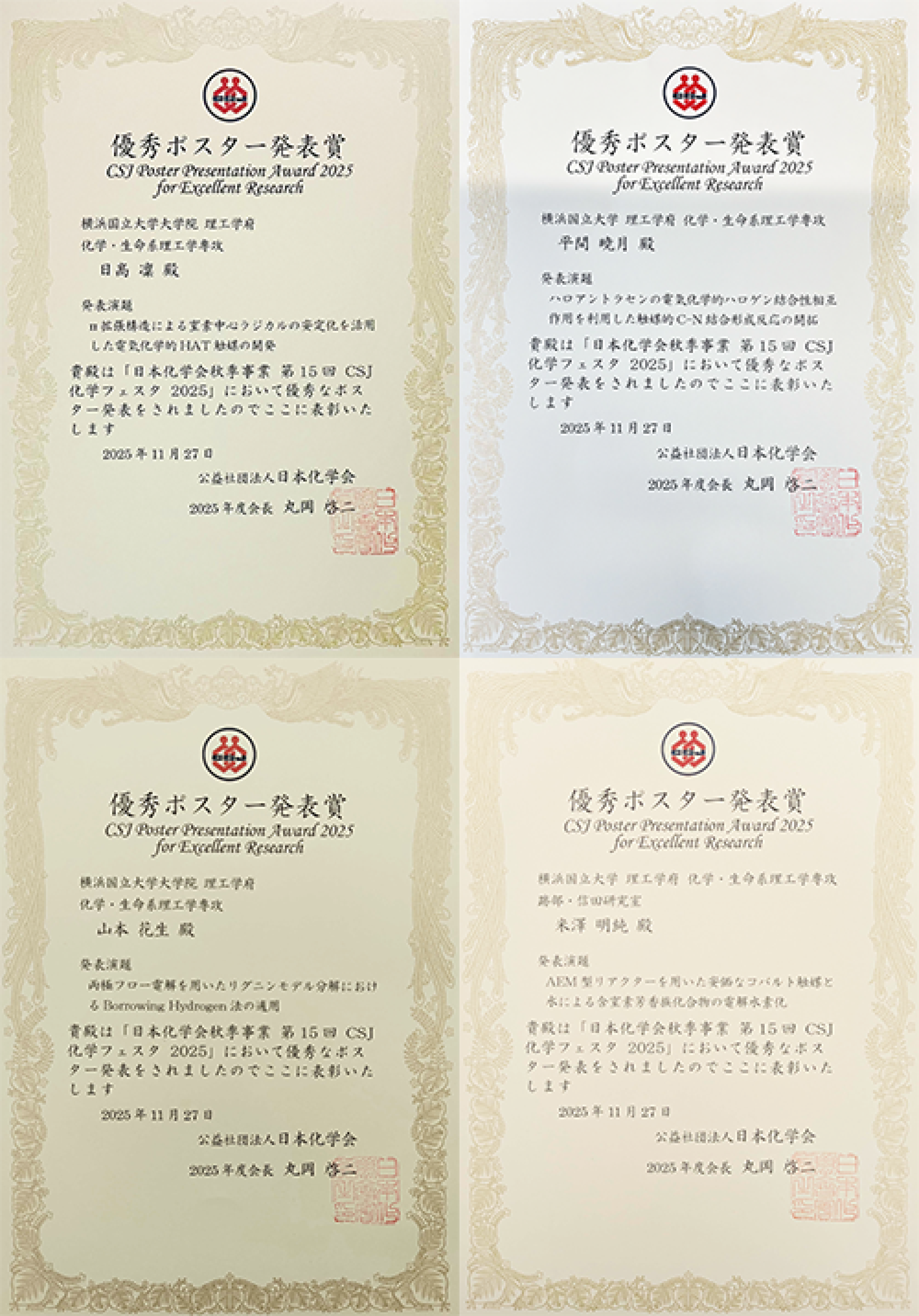 2025年 10月 22日~ 24日に、船堀タワーホール(東京)で開催された日本化学会秋季事業 第 15回 CSJ 化学フェスタ(主催:公益社団法人日本化学会)において、大学院理工学府 博士課程前期 2年 平間暁月さん、博士課程前期 2年 米澤明純さん、博士課程前期 1年日髙凜さん、博士課程前期 1年山本花生さん、(指導教員:跡部真人 教授、信田尚毅 准教授)それぞれが発表した研究内容に対して、優秀ポスター発表賞が授与されました。