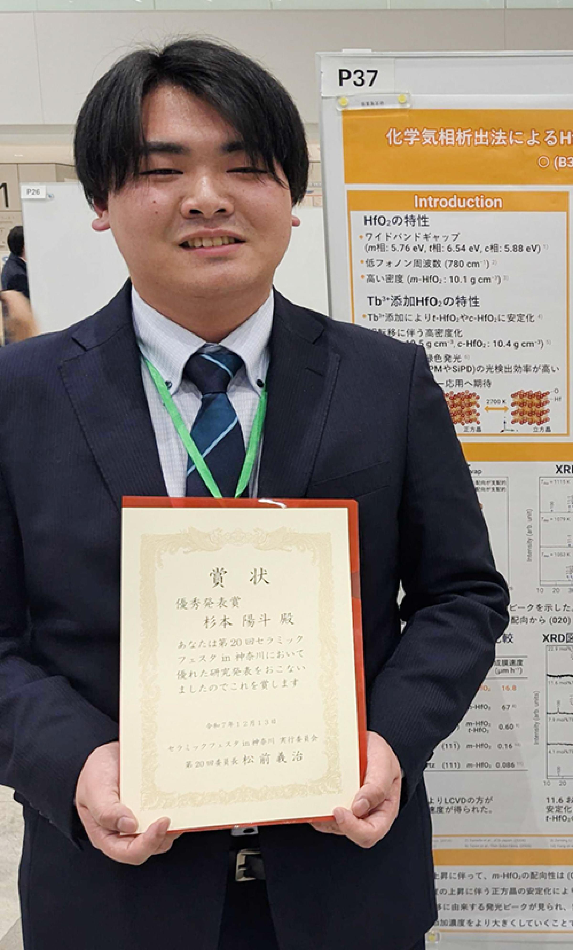 2025年 12月 13日(土)、東海大学で開催された「第20回セラミックフェスタ in 神奈川」において、理工学部 化学・生命系学科 化学 EP 3年の杉本陽斗さん (指導教員: 伊藤暁彦 教授) が、「優秀発表賞」を受賞しました。