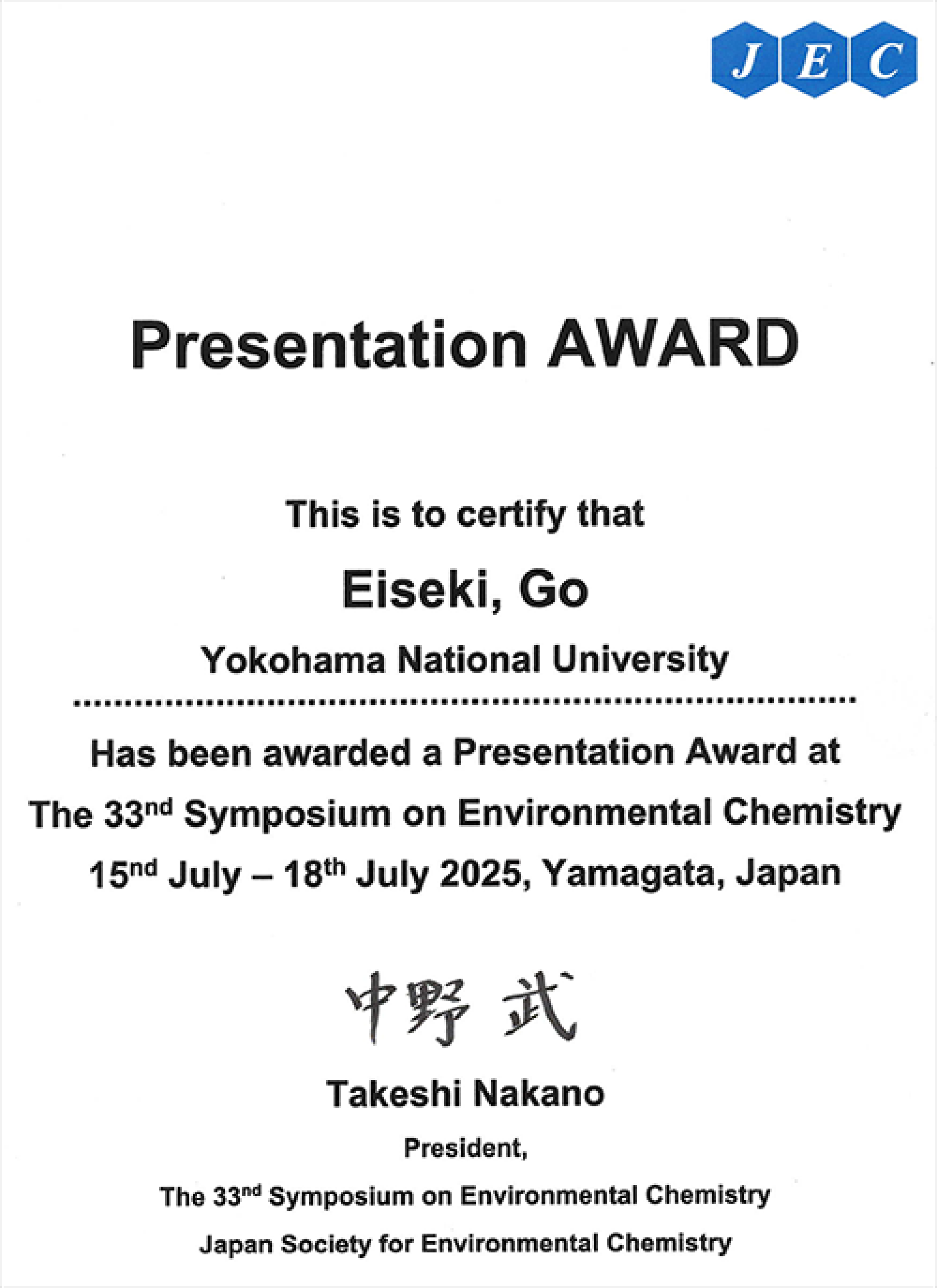 2025年 7月 15日~18日、「山形テルサ」および「やまぎん県民ホール」で開催された第 33回環境化学討論会 / 第 29回日本環境毒性学会研究発表会の合同大会である「第 4回環境化学物質合同大会」にて理工学部 化学・生命系学科 化学応用教育プログラム 4年の呉英碩さん (指導教員:三宅祐一教授) が優秀発表賞(Presentation Award)を受賞しました。