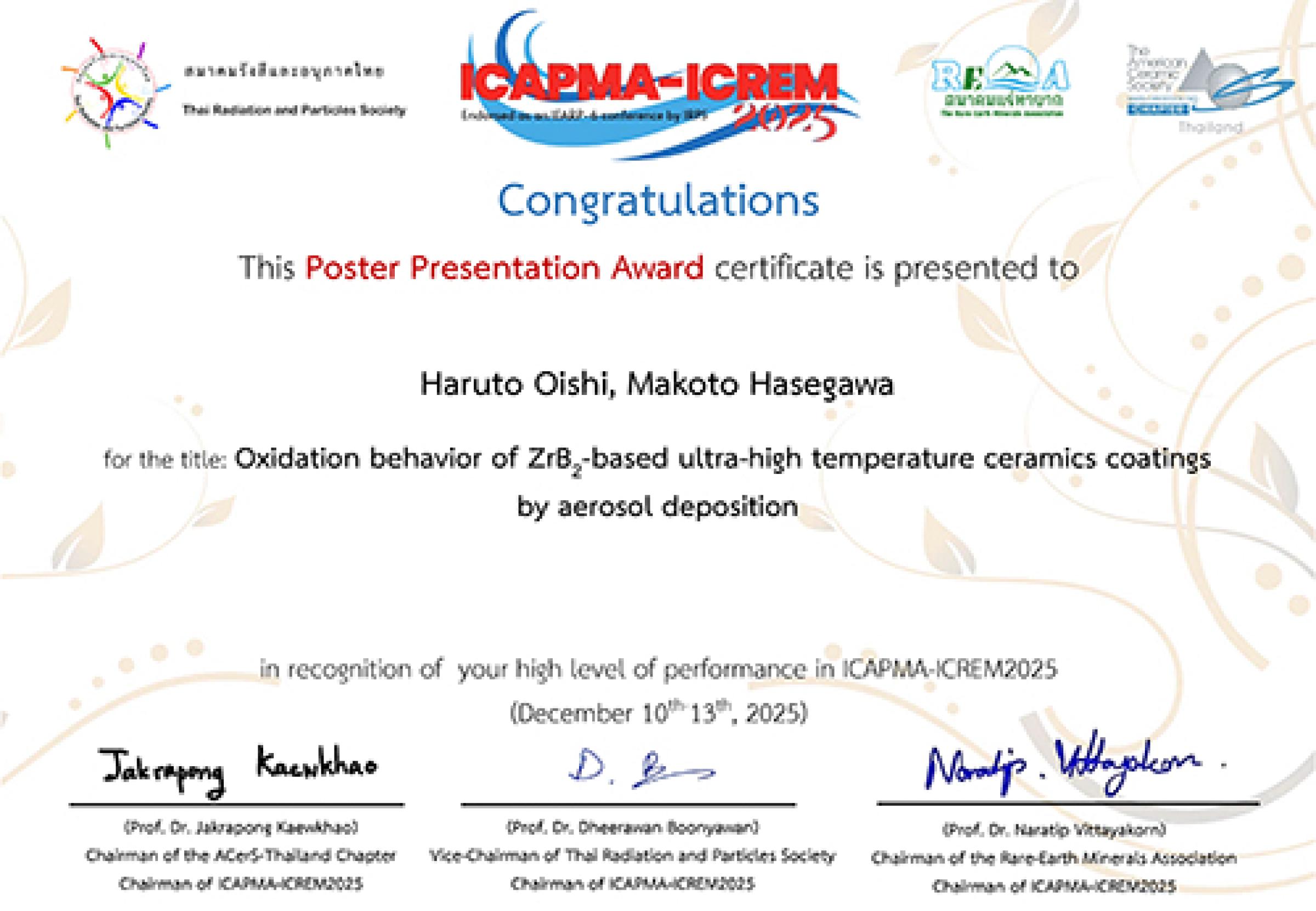 2025年 12月 10日から 13日にタイ・パタヤで開催された The 7th International Conference on Applied Physics and Materials Applications 2025 において、大学院理工学府 機械・材料・海洋系工学専攻 材料工学教育分野 博士課程前期 1年の大石陽翔さん(指導教員:長谷川誠 教授)が、「Poster Presentation Award」を受賞しました。