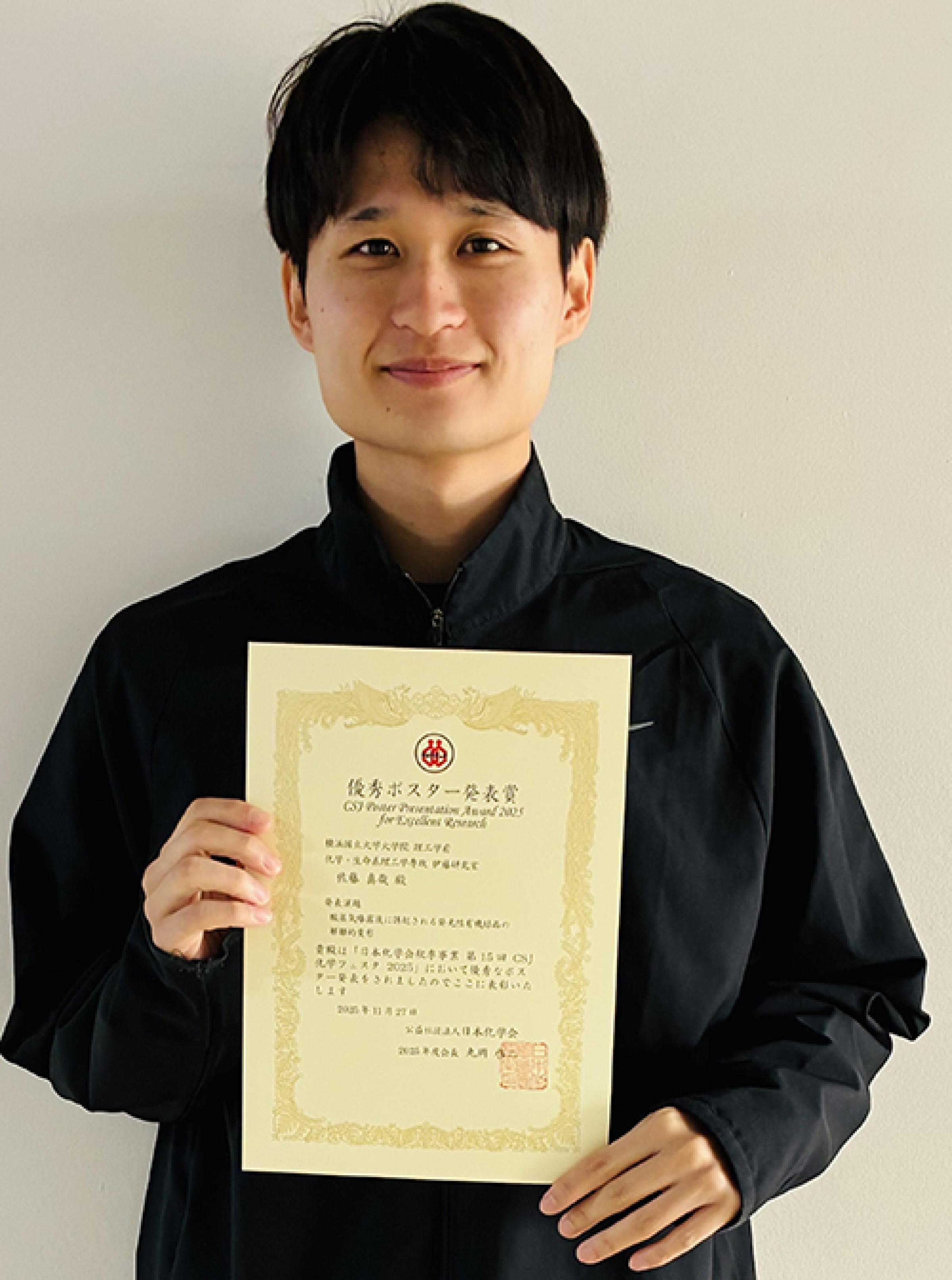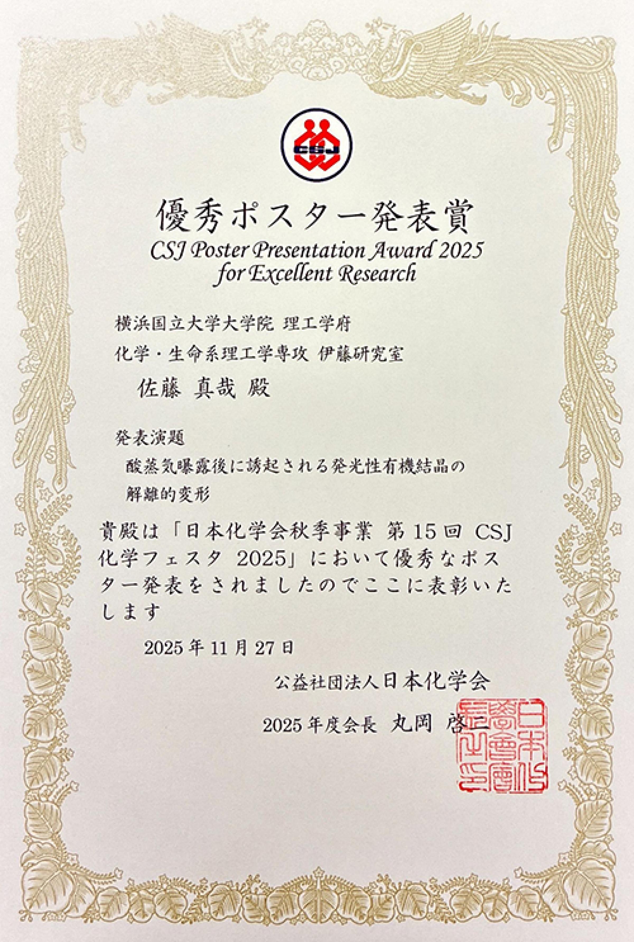 大学院理工学府博士課程前期 2年の佐藤 真哉さん(指導教員:伊藤 傑 准教授)が、2025年 10月 22日(水)〜 24日(金)にタワーホール船堀で開催された日本化学会秋季事業 第15回CSJ化学フェスタ2025で「優秀ポスター発表賞」を受賞しました。