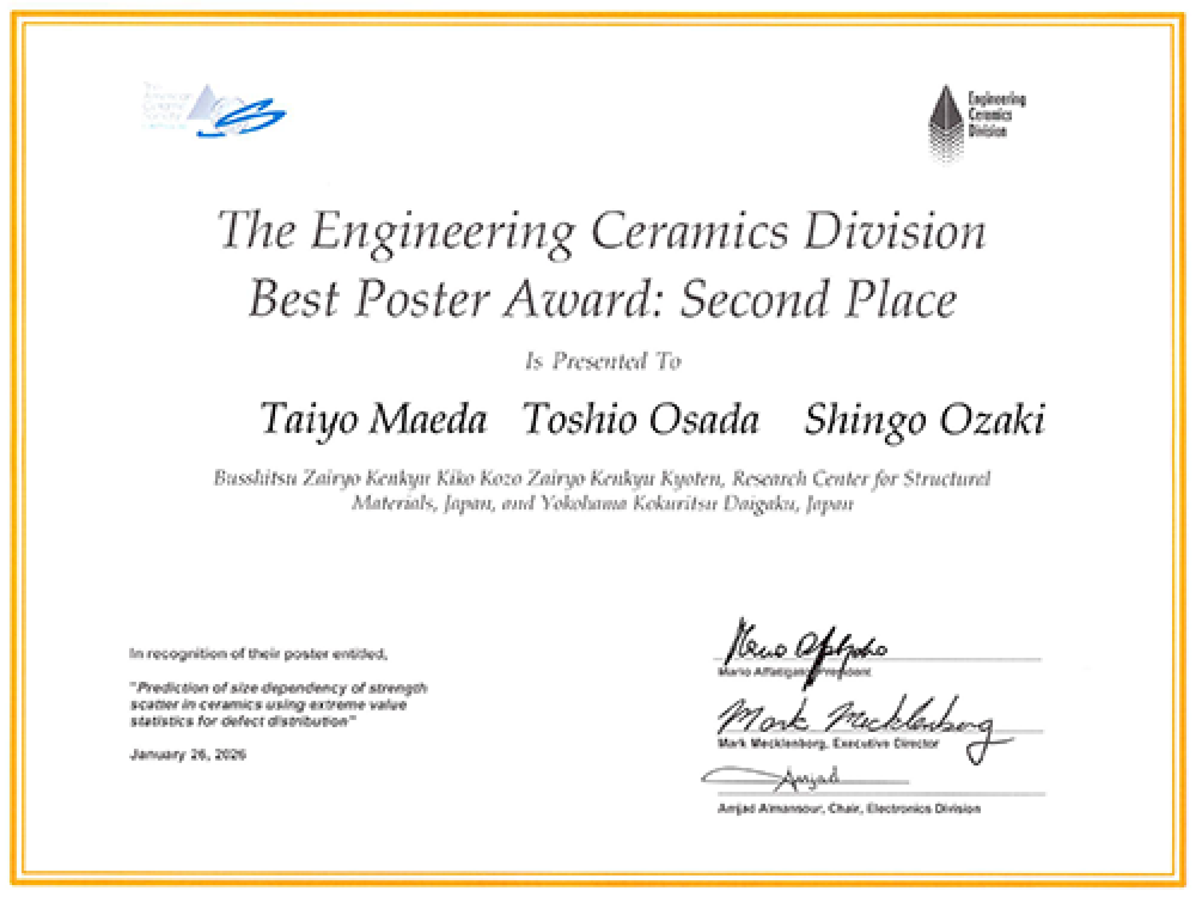 セラミックスの製造時に生じる欠陥の統計処理に極値統計モデルを適用することで、強度のばらつきやサイズ依存性を予測可能とした研究内容が高く評価されました。発表件数は約 160件あり、アジア勢からは唯一の受賞となります。