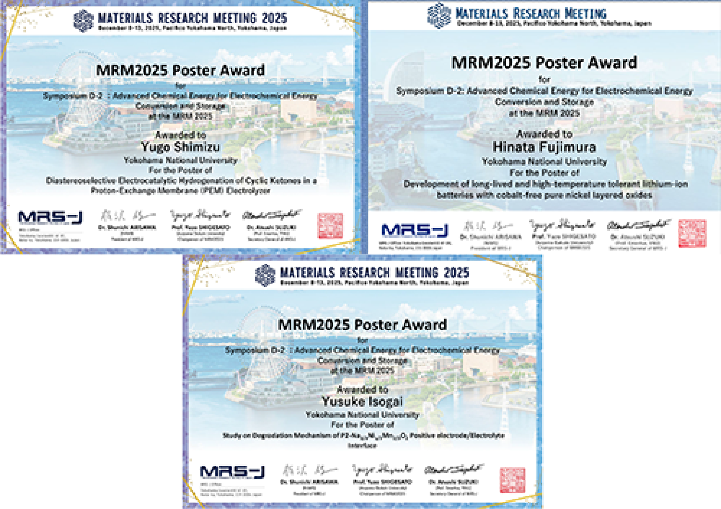 2025年 12月 8日〜 13日にパシフィコ横浜において開催されたMaterials Research Meeting 2025において、大学院理工学府博士課程後期 1年の清水勇吾さん(指導教員:跡部真人 教授)、同博士課程前期 2年の藤村陽大さん(指導教員:藪内 直明 教授)、同博士課程前期 2年の磯貝勇輔さん(指導教員:多々良 涼一 准教授)がMRM2025 Poster Awardを受賞しました。