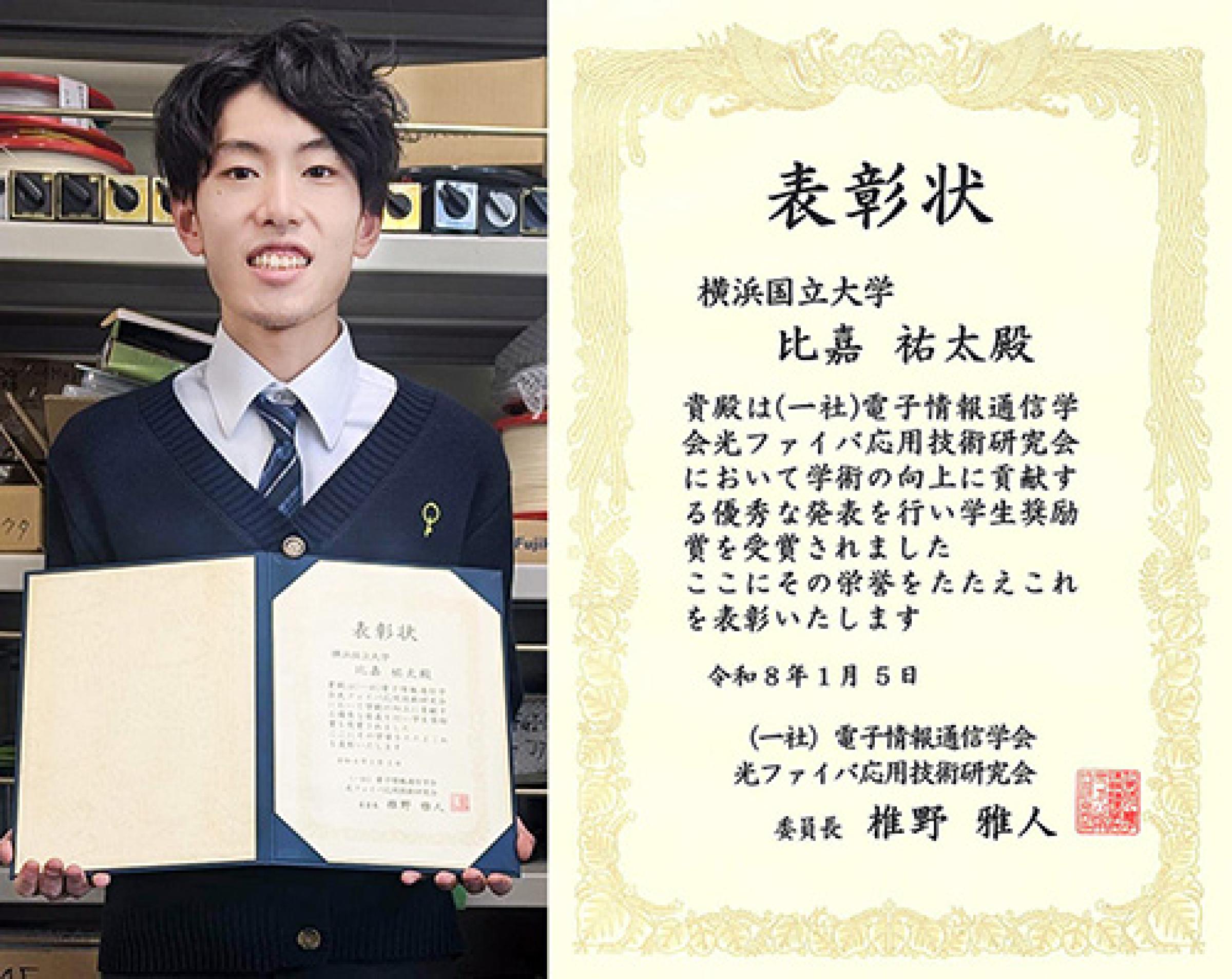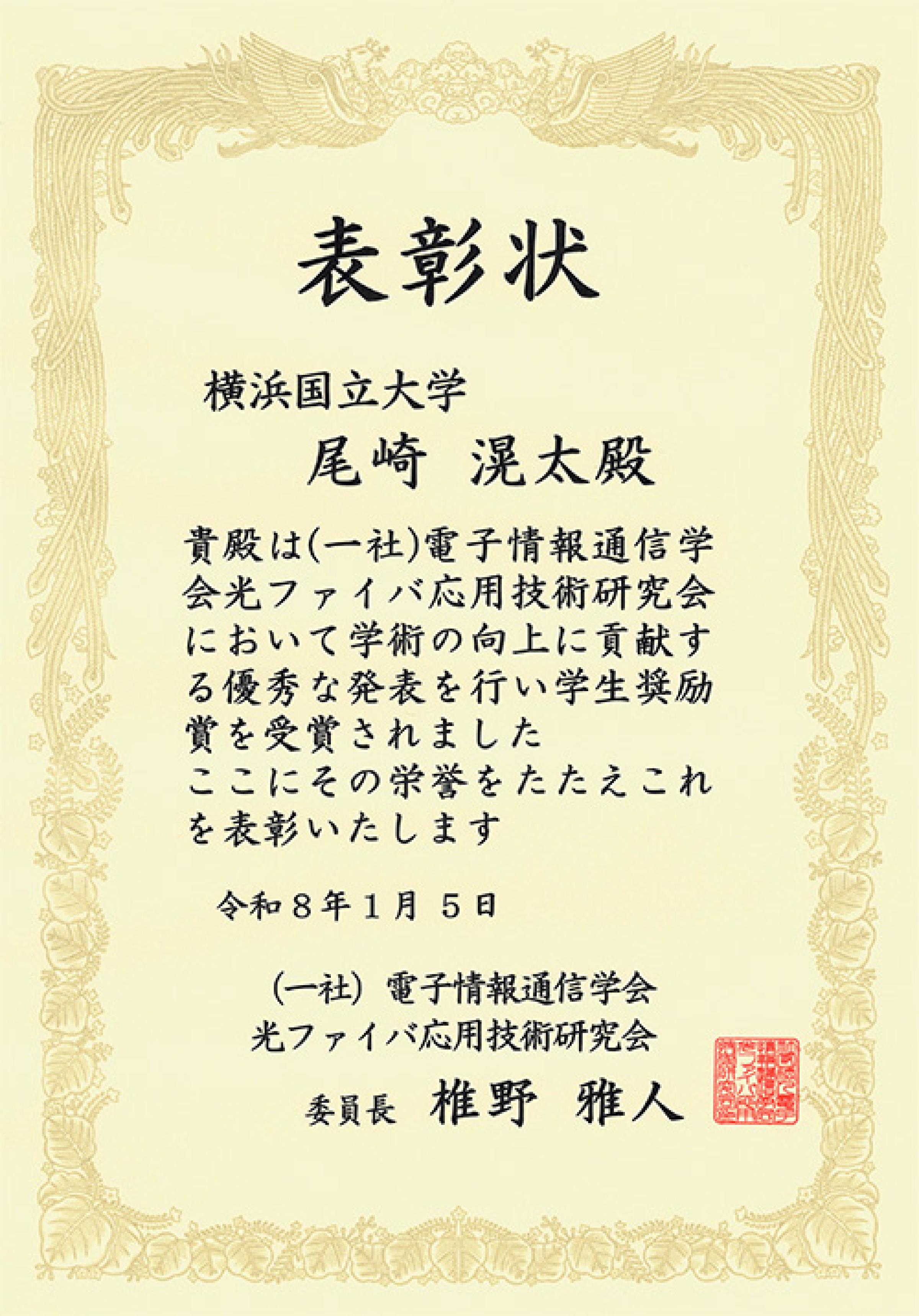 大学院理工学府博士課程前期を2025年3月に修了した尾崎滉太さんと、大学院理工学府博士課程前期2年の比嘉祐太さん(指導教員:水野洋輔 准教授)が、2025年1月および10月に開催された光ファイバ応用技術(OFT)研究会における講演に対して、学生奨励賞を受賞しました。