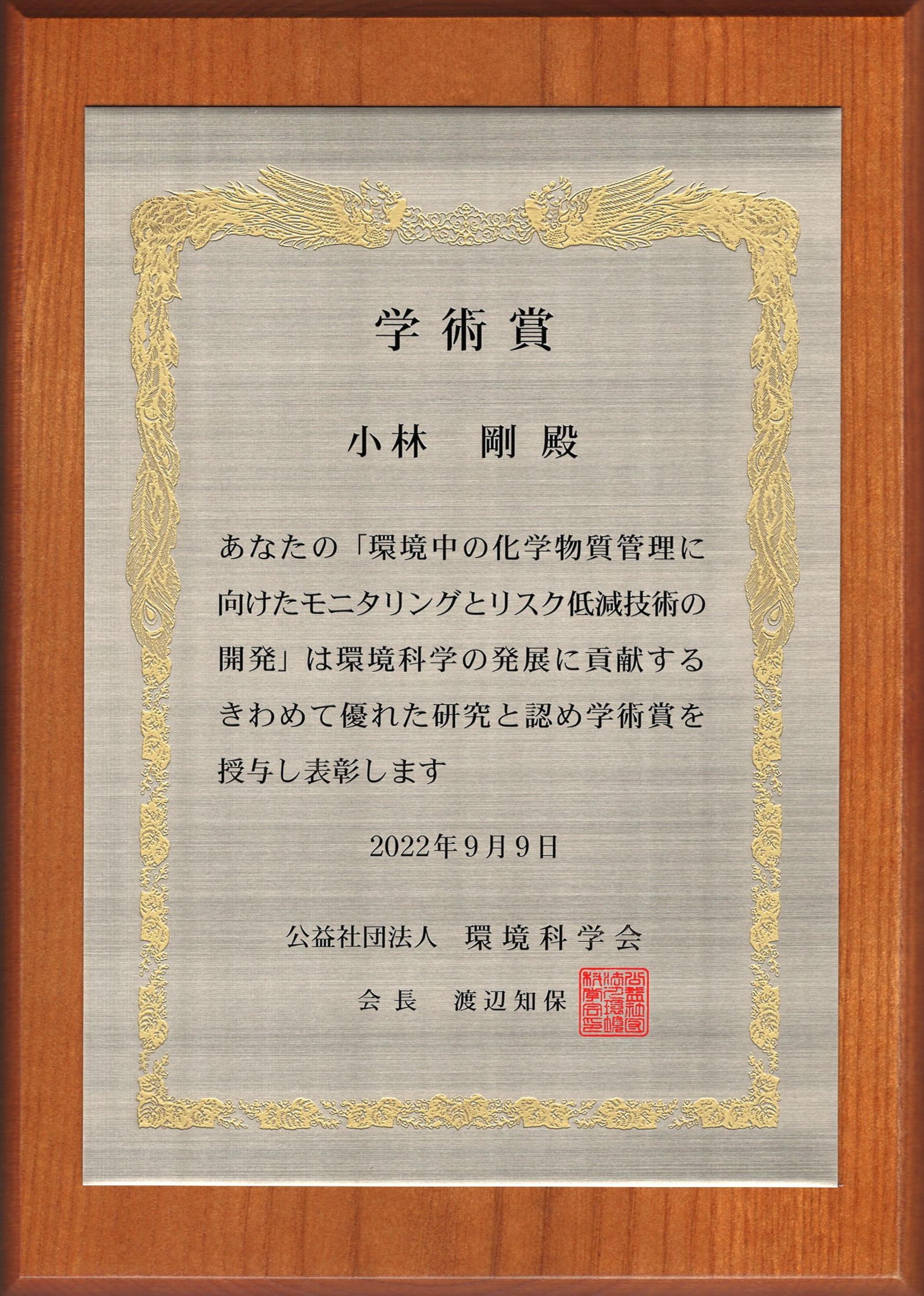 環境情報研究院 小林剛准教授が公益社団法人環境科学会の学術賞を受賞し、2022年9月9日に開催された表彰式において表彰されました。