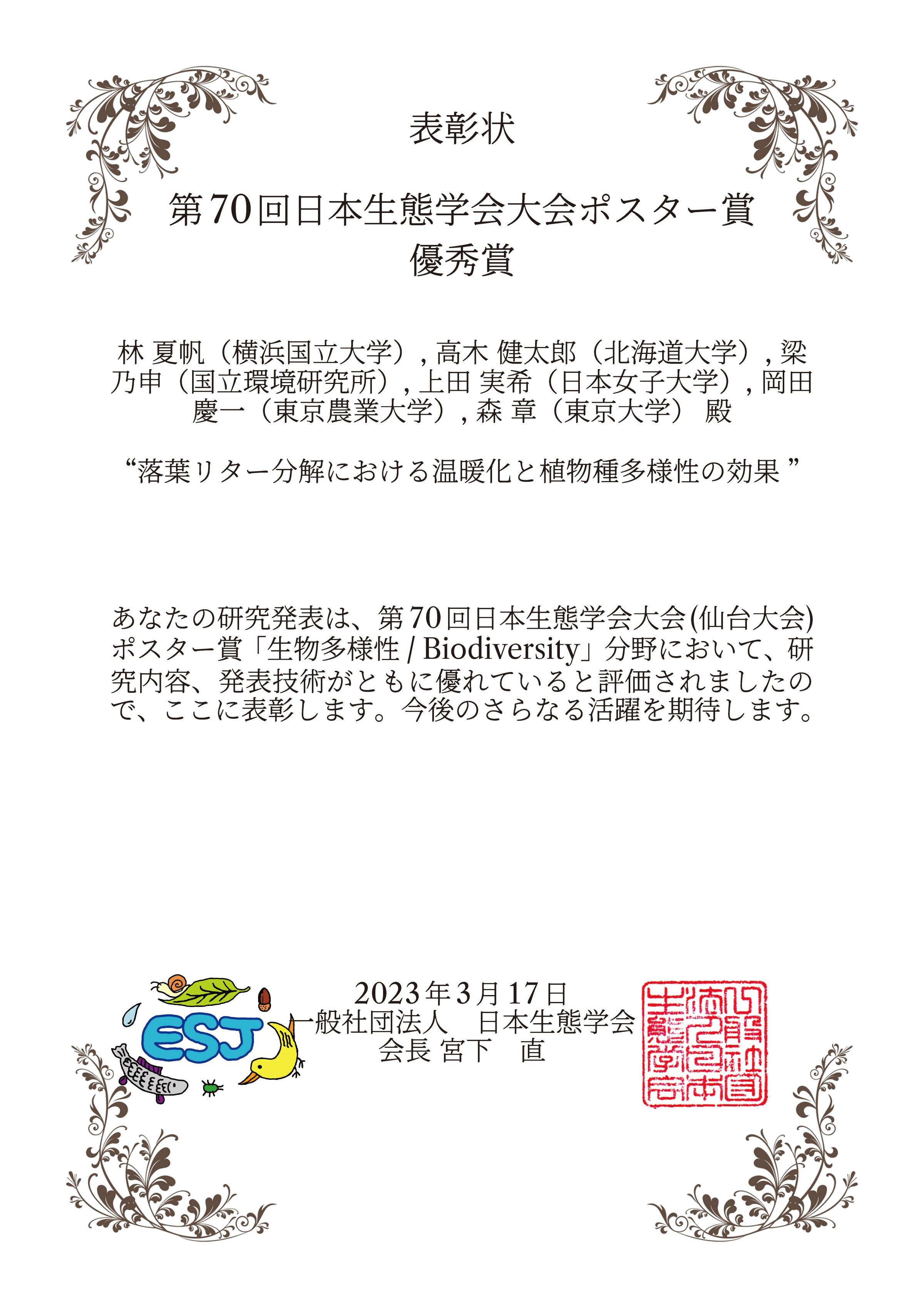 2023年3月に開催された 第70回日本生態学会大会(仙台大会)ポスター賞「生物多様性/ Biodiversity」分野において、環境情報学府 佐々木研究室所属の林 夏帆さんがポスター賞 優秀賞 を受賞した。 タイトル “落葉リター分解における温暖化と植物種多様性の効果”