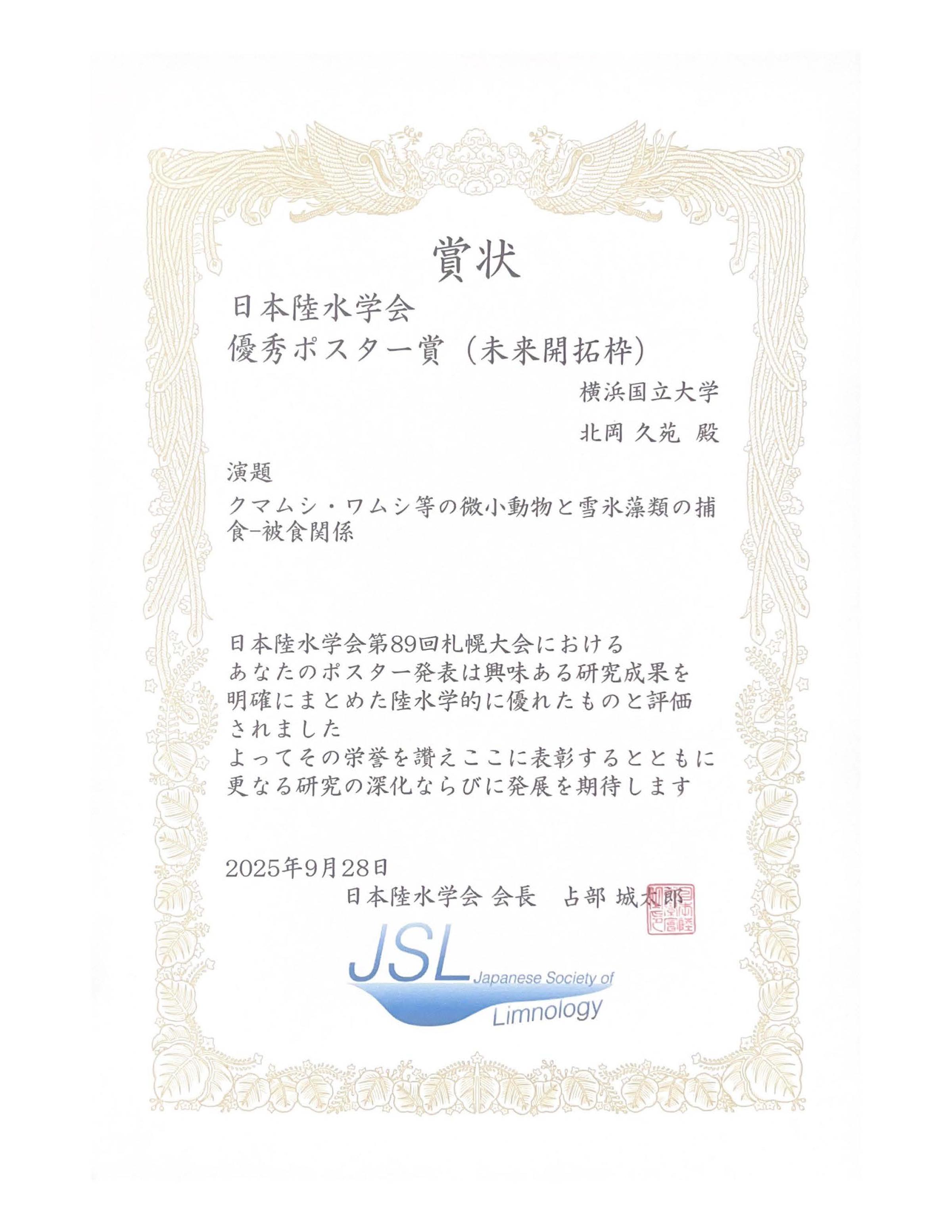 都市科学部環境リスク共生学科 4年の北岡 久苑さんが「クマムシ・ワムシ等の微小動物と雪氷藻類の捕食-被食関係」優秀ポスター発表賞(未来開拓枠)を受賞されました。