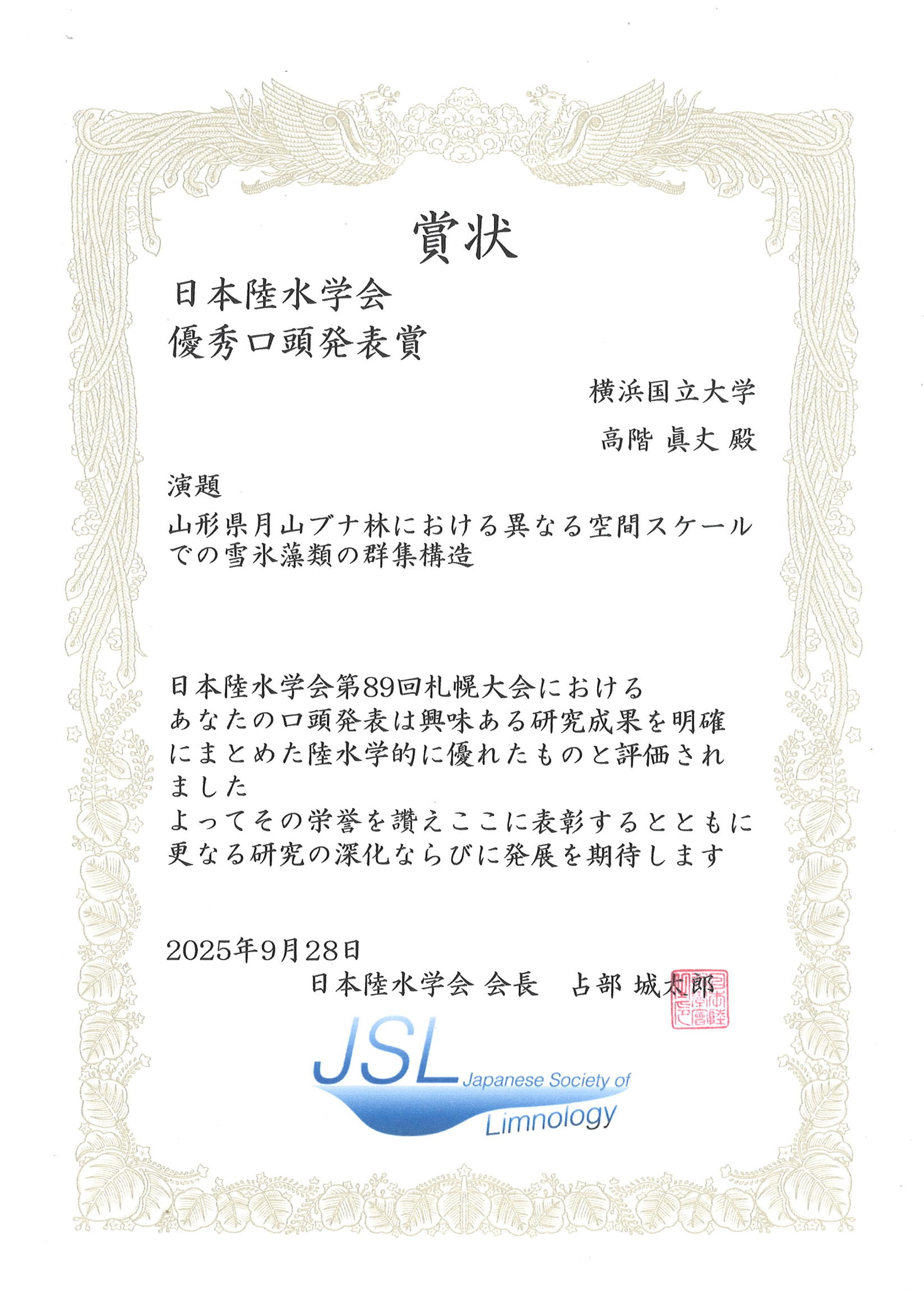 2025年9月25日より北海道大学にて開催された 日本陸水学会札幌大会において 環境情報研究院 鏡味研究室 修士2年 高階 眞丈さんが 「優秀口頭発表賞」を受賞されました