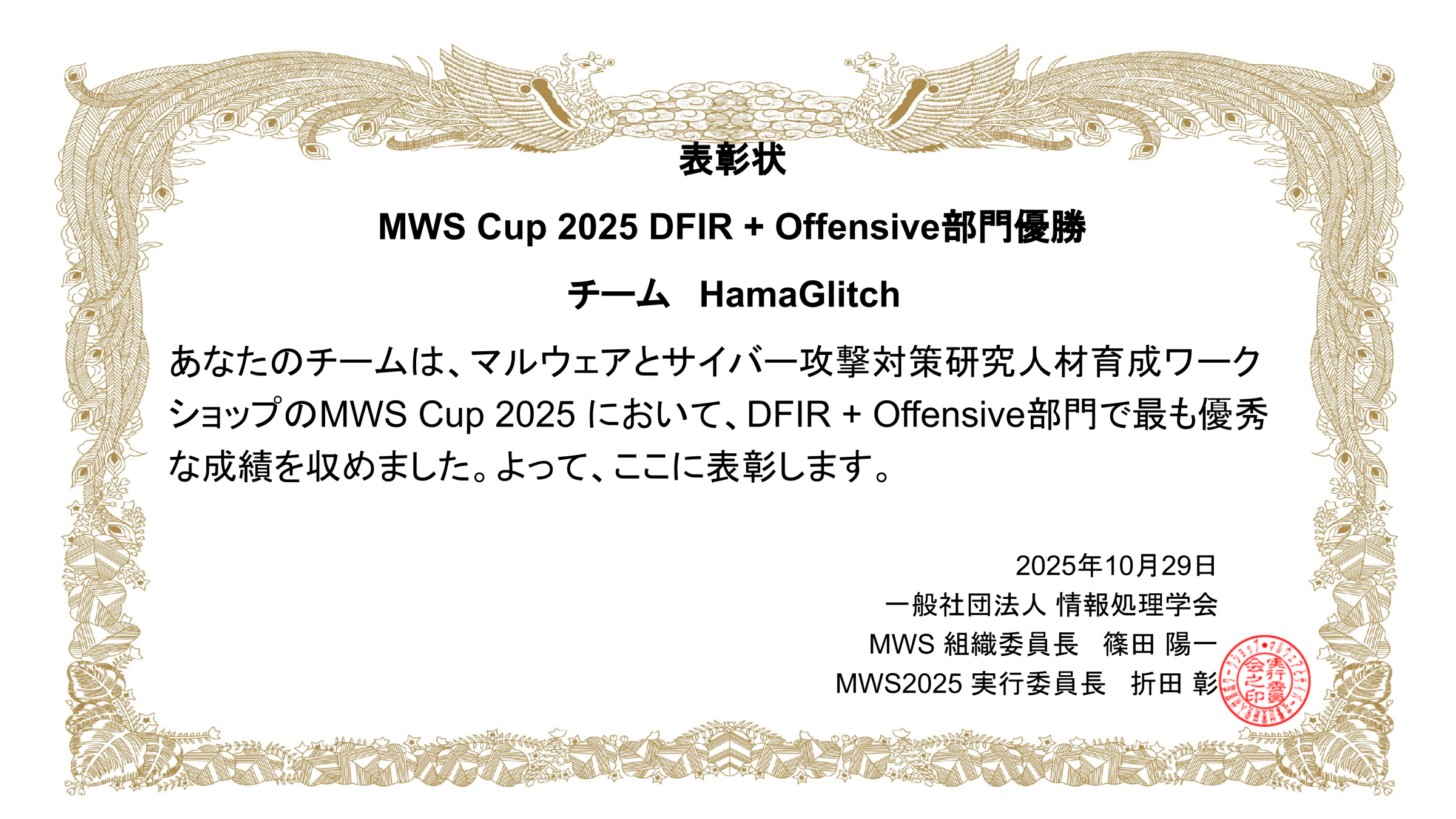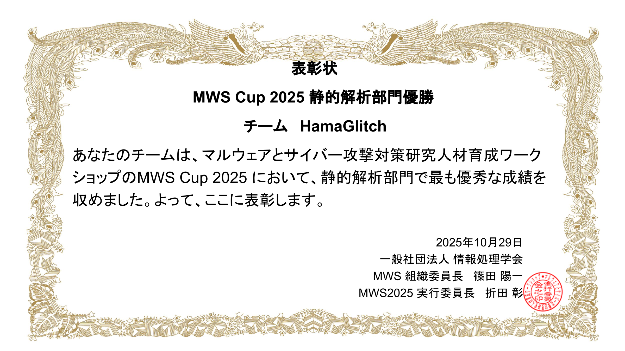 コンピュータセキュリティシンポジウム2025(CSS2025)併催のマルウェアとサイバー攻撃対策研究人材育成ワークショップ2025(MWS2025)内で開催された、MWS Cupにて、吉岡研究室の所属学生で構成されたチームHamaGlitchが、DFIR+Offensive部門および静的解析部門で優勝しました。