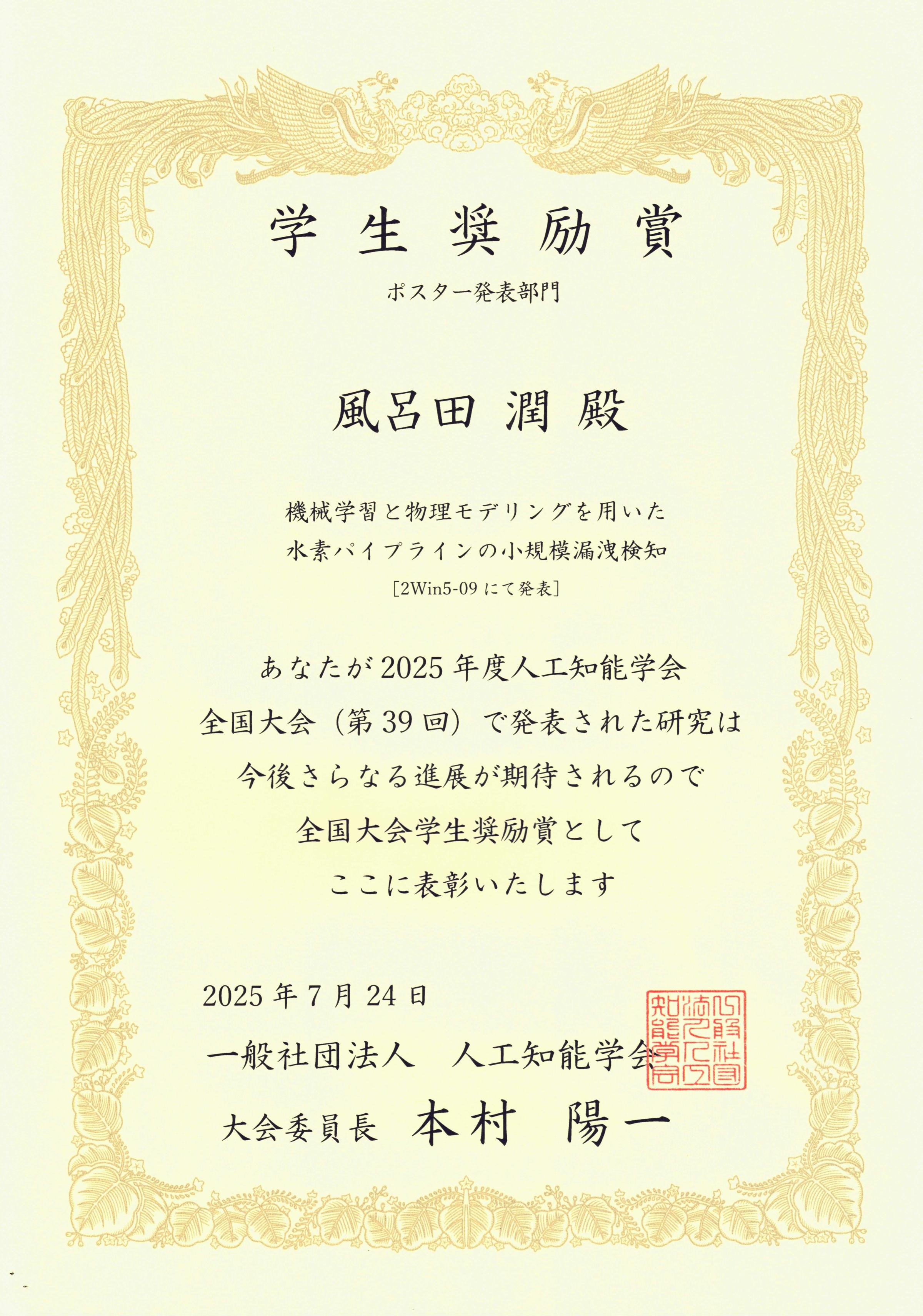 環境情報学府人工環境専攻・博士課程前期2年の風呂田潤さん(指導教員:伊里友一朗 准教授)が2025年5月27日~30日にかけて大阪国際会議場にて開催された2025年度 人工知能学会全国大会(第39回)において全国大会学生奨励賞を受賞しました。本賞は、審査委員会による審査を経て、当該学会の学術または技術への貢献を考慮の上,新規性または有用性を評価されて選考されたものです。