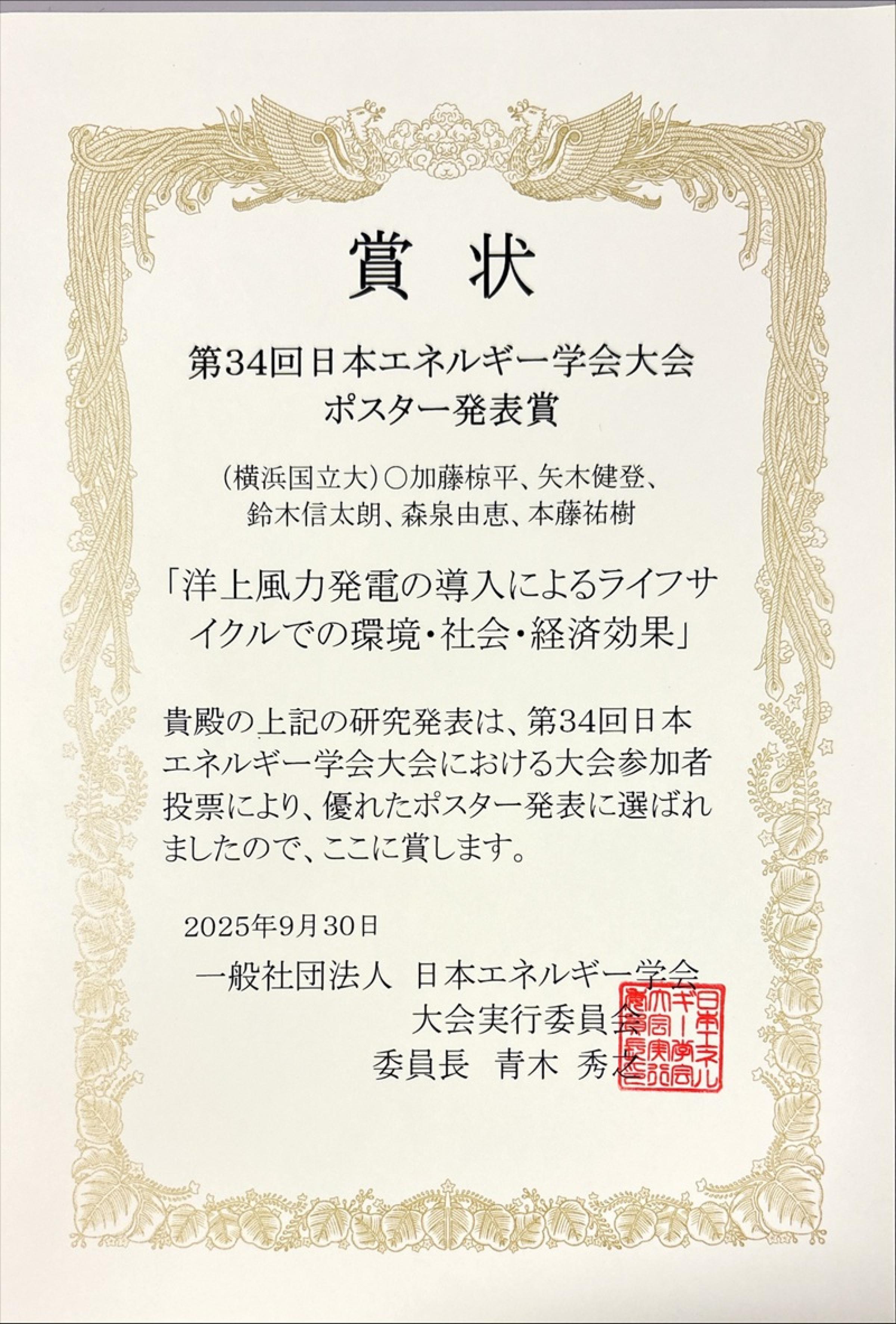 2025年8月6日~8日に開催されました第34回日本エネルギー学会大会において、環境情報学府の加藤椋平さん、矢木健登さん、鈴木信太朗さん、環境情報研究院の森泉由恵非常勤教員、本藤祐樹教授が、ポスター発表賞を受賞しました。