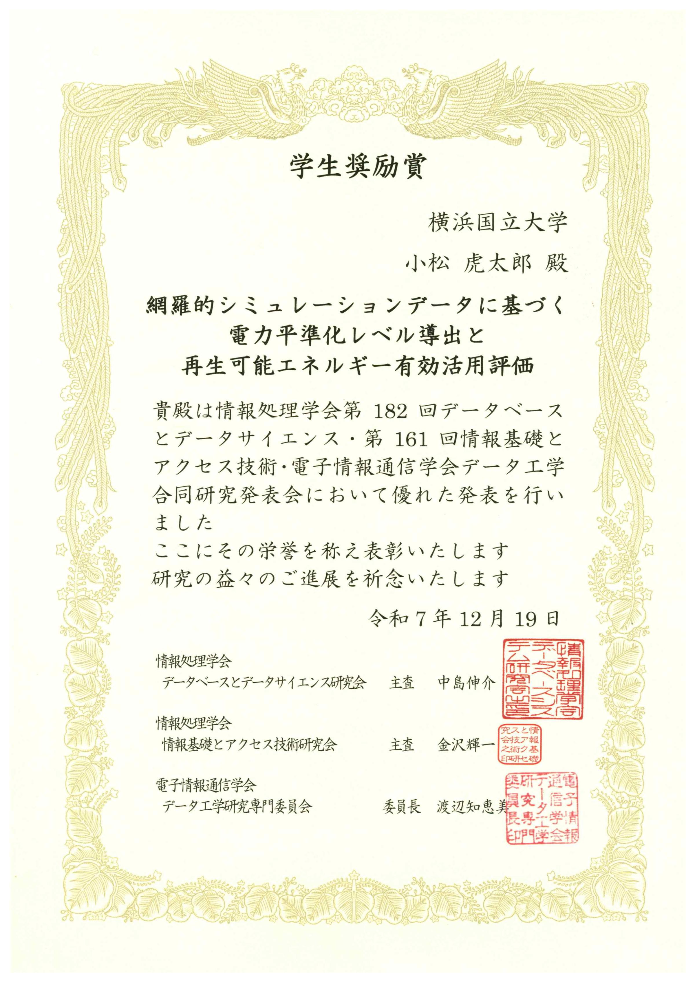 2025年12月19日に奈良先端科学技術大学院大学で開催された情報処理学会第182回データベースシステム・第161回情報基礎とアクセス技術・電子情報通信学会データ工学合同研究発表会において、大学院環境情報学府博士課程前期2年の小松虎太郎さん(指導教員:富井尚志教授)が「学生奨励賞」を受賞しました。