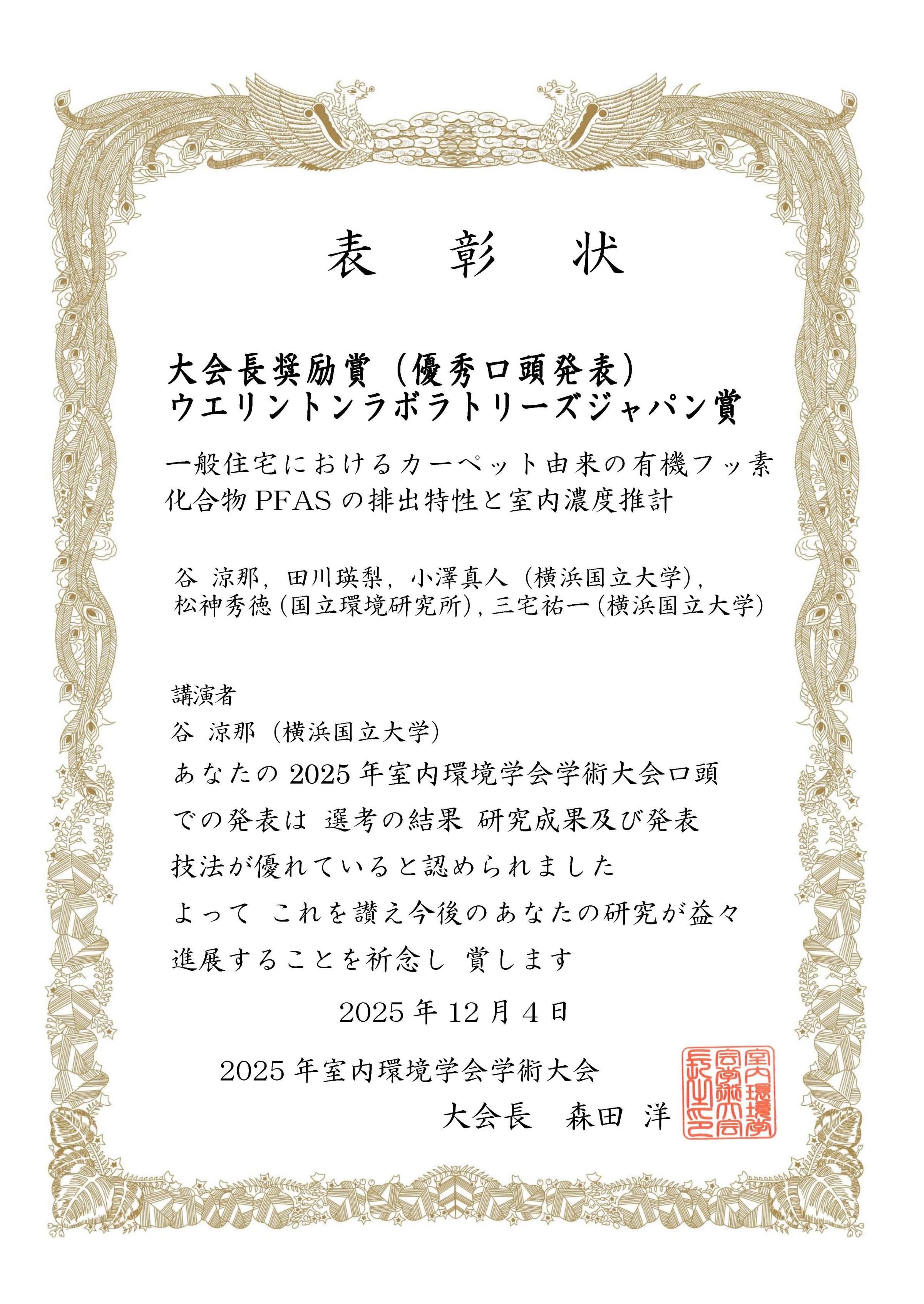 2025年 12月 2日~ 5日、北九州国際会議場で開催された2025年室内環境学会学術大会にて大学院環境情報学府博士課程前期 1年の谷涼那さん (指導教員: 三宅祐一 教授) が大会長奨励賞(優秀口頭発表賞)(ウエリントンラボラトリーズジャパン賞)を受賞しました。